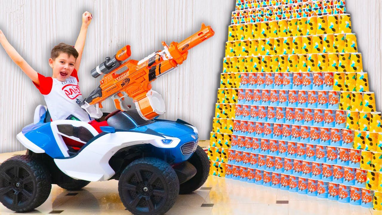 Артём играет с игрушками и строит из стаканчиков гигантскую пирамиду, а затем рушит пирамиду на машине.