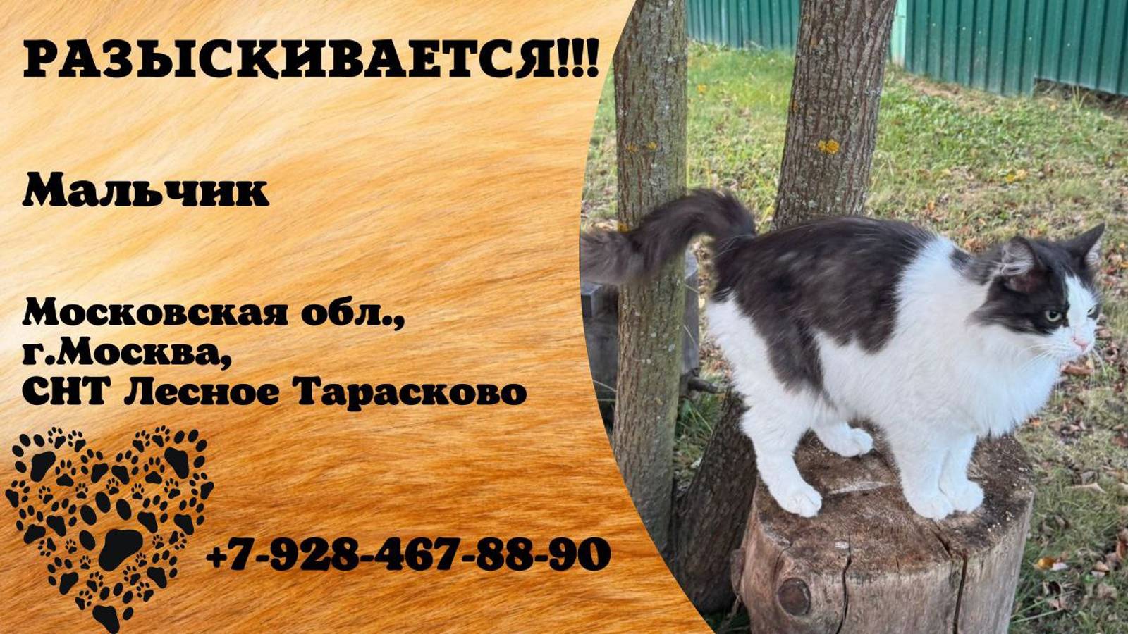 Московская Москва Пропал кот Пропал наш любимец снт Лесное Тарасково.. ушел вечером 13.10 и до сих пор нет .. на коте синий ошейник .. кот умный не агрессивный , кастрирован . Просьба помочь в розыске беглеца любую информацию можно сообщить по номеру 89284678890 вознаграждение 10000рублей Инфо https://vk.com/wall-198815410_157287 Автор https://vk.com/nastena0208