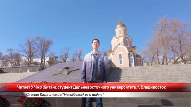 Студент из Китая, У Чжо, душевно и при этом эмоционально, прочитал моё стихотворение "Не забывайте о войне". Стихи прозвучали на Корабельной набережной Владивостока, где и был снят видеоролик для участия в V конкурсе чтецов "Победа в сердцах поколений". У Чжо учится на втором курсе Дальневосточного федерального университета (направление "лингвистика"). На видео китайский студент ДВФУ рассказал: "Здесь во Владивостоке, на корабельной набережной, много памятников Великой Отечественно войне. Я прочитаю стихотворение Степана Кадашникова "Не забывайте о войне". В создании фильма принимали участие: преподаватель каф. РКИ ДВФУ Роднова Мария Андреевна и оператор Гао Цзыцянь. Еще одна конкурсантка, из Малайзии, завоевала 2 место на конкурсе чтецов "Победа в сердцах поколений" со стихотворением "Летела с фронта похоронка". Стихотворение Степана Кадашникова о войне замечательно прочитала Ирфан Афифах Бинти Мохд Фаируз, студентка Курского государственного медицинского университета. 20 июня в Совете Федерации состоялась торжественная церемония награждения победителей V конкурса чтецов для иностранных студентов и аспирантов «Победа в сердцах поколений». Радует, что на сегодняшний день стихи прочитали более чем в 40 странах мира. Особенно приятно, когда в исполнении иностранцев звучат мои стихи о войне. География выступлений впечатляет, она простирается от братских нам республик, до экзотических уголков планеты, таких как: Нигерия, Малайзия, Зимбабве, Маврикий, Уганда, Индия и др. НЕ ЗАБЫВАЙТЕ О ВОЙНЕ Не забывайте о войне. Cвоим потомкам передайте Как гибли прадеды в огне, Вы подвиг предков не предайте. Не забывайте обелиски На месте подвигов былых. Пускай война уже не близко, Вы, всё же, помните о них. Не забывайте, в праздный час, О тех, кто на войне остался. Гордитесь теми, кто за Вас В последний, смертный, бой поднялся. Не забывайте никогда Заплаченную ими цену. Храните в памяти, тогда, Не обесцените победу. Пусть шепчут, в спину Вам, враги: - Забудьте след былых времен... Но прошлый опыт говорит: - Забыл победу - побежден! Не забывайте о войне. Держите флаг победы выше. Наказывает жизнь, вдвойне, Победу и беду забывших. © Степан Кадашников Конкурс чтецов среди студентов и аспирантов из стран Азии и Африки «Победа в сердцах поколений», был организован Российским комитетом солидарности и сотрудничества с народами Азии и Африки. В этом году конкурсантами стали более 600 иностранных студентов и аспирантов из 76 стран (Африки (41) и Азии (29). Некоторые участники, такие как представители стран Европы и Латинской Америки, выступали вне конкурса. Все конкурсанты – обучающиеся в 90 российских вузах и их филиалах от Владивостока до Калининграда, проявляющие интерес к изучению русского языка и литературы. Больше всего заявок получено от студентов из Китая, Индии, Туркменистана и Сирии (Азия), а также от представителей Марокко, Нигерии и Египта (Африка). В этом году на конкурсе среди произведений авторов, прославлявших в своих стихах героев Великой Отечественной войны и призывающих хранить память о жертвах войны, звучали строки, написанные как десятилетия назад, так и современными поэтами. ❗Если Вы любите декламировать стихи и Вам понравилось одно из стихотворений, запишите свое видео и отправьте администратору группы "Поэт Степан Кадашников. Стихи. Песни. Музыка