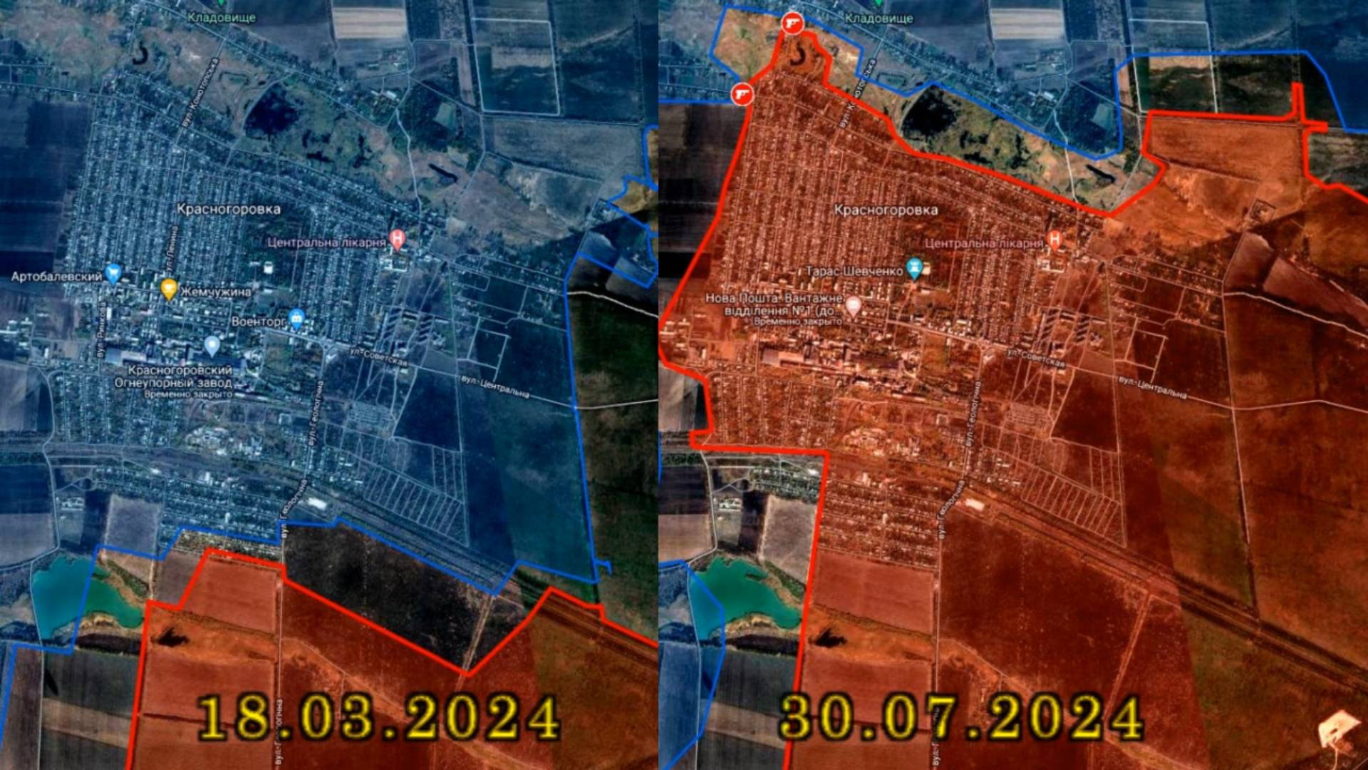 Карта боевых действий за Красногоровку с март по июль 2024 года