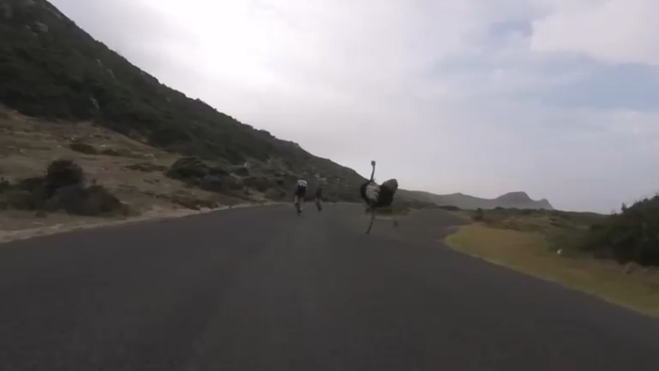 Страус гонится за велосипедистами