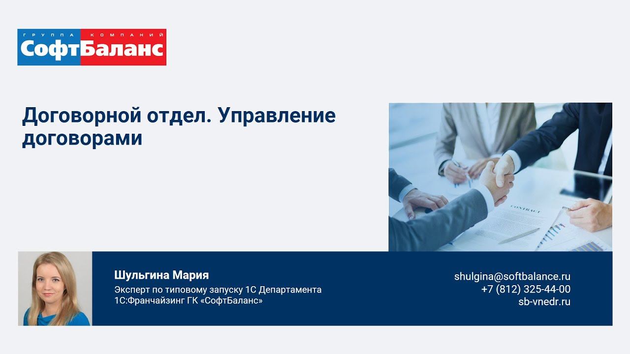 ГК "СофтБаланс" https://sb-vnedr.ru/ Договорной отдел. Управление договорами в 1С:Документооборот • Создание и хранение договоров. Учет версий; • Согласование. Настройка маршрутов; • Условная маршрутизация; • Связанные документы Внедренные проекты https://sb-vnedr.ru/vnedrenie-1c/ Решение корпоративных задач https://sb-vnedr.ru/avtomatizatsiya/ Получать приглашения на бесплатные мероприятия https://sb-vnedr.ru/about/meropriyatiya/subscribe/ https://youtu.be/qAEWIElNBWs