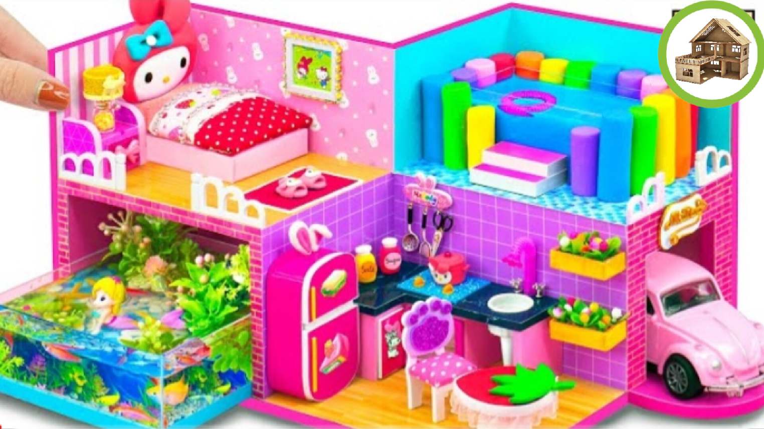 Миниатюрный мелодичный домик с подземным аквариумом и с цветным бассейном для семьи из картона /182