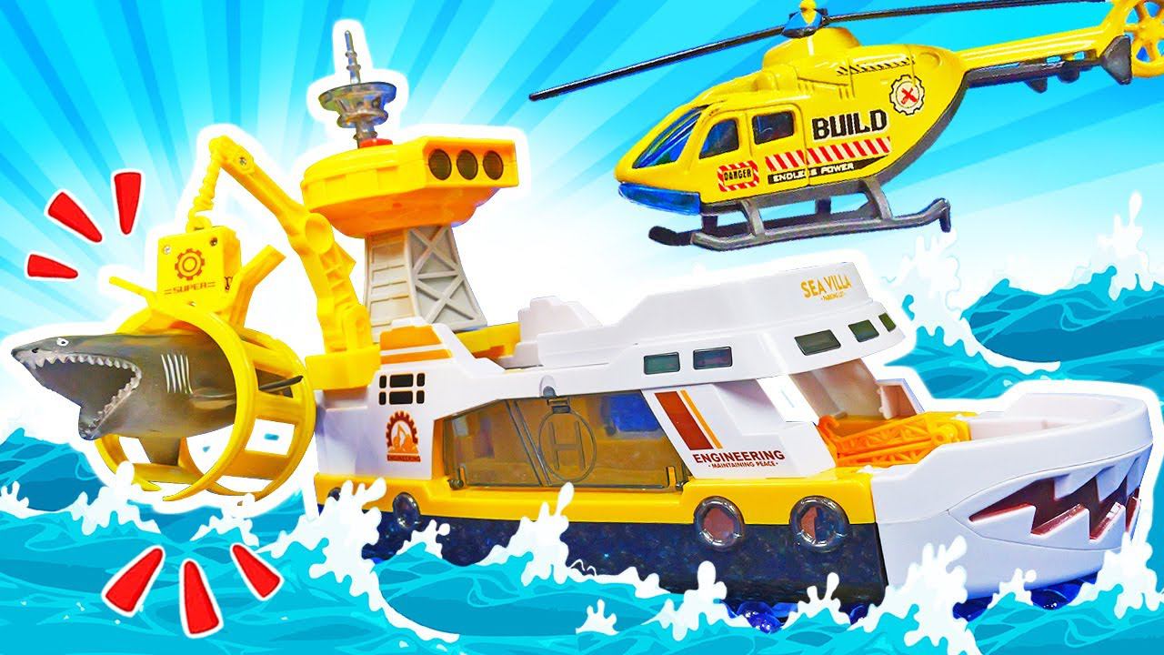 Машины помощники ловят АКУЛУ Распаковка патрульного корабля. Видео для детей про игрушки