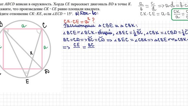 Квадрат вписан в окружность. Хорда пересекает диагональ в точке . а) Докажите, что произведение ∙ равно площади квадрата. б) Найдите отношение : , если ∠ = 15°.