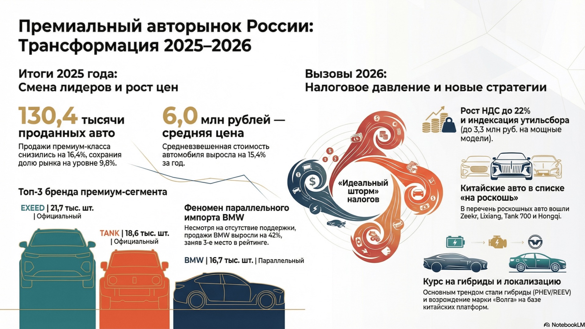 Анализ динамики и структурной трансформации рынка премиальных автомобилей в России: итоги 2025 года и комплексный прогноз на 2026 год Документ представляет углубленный анализ динамики и структурной трансформации российского рынка премиальных автомобилей, охватывая итоги 2025 года и комплексный прогноз на 2026 год. В начале 2026 года рынок характеризуется как уникальная экосистема, балансирующая между фискальным давлением и изменяющимися потребительскими предпочтениями. В 2025 году продажи новых премиальных автомобилей снизились на 16,4% до 130,4 тысяч единиц, что совпадает с общеотраслевой тенденцией, однако доля сегмента на рынке осталась стабильной на уровне 9,8%. Количественное снижение компенсировалось качественным ростом технологической насыщенности и увеличением средней стоимости транзакции на 15,4%. Экономическая значимость премиум-сегмента остается непропорционально высокой, генерируя 32% всех расходов россиян на покупку новых автомобилей в декабре 2025 года. Лидерство в официальном секторе закрепили китайские производители, такие как EXEED, TANK и Hongqi, в то время как европейские марки, например BMW, показали значительный рост (+42%) за счет параллельного импорта, что свидетельствует о сохраняющемся спросе на традиционный престиж. Прогноз на 2026 год указывает на «идеальный шторм» из-за регуляторных изменений, включая повышение НДС до 22% и индексацию утилизационного сбора, что приведет к существенному росту цен по всей цепочке стоимости. #РоссийскийАвторынок #ПремиальныеАвтомобили #АнализРынка #Итоги2025 #Прогноз2026 #ФискальноеДавление #ПовышениеНДС #ЛидерыБрендов #Автоиндустрия #ТрендыРынка документ - https://t.me/autoanalitic подписаться - https://t.me/arxivpaperu отправить донаты: USDT: 0xAA7B976c6A9A7ccC97A3B55B7fb353b6Cc8D1ef7 BTC: bc1q8972egrt38f5ye5klv3yye0996k2jjsz2zthpr ETH: 0xAA7B976c6A9A7ccC97A3B55B7fb353b6Cc8D1ef7 SOL: DXnz1nd6oVm7evDJk25Z2wFSstEH8mcA1dzWDCVjUj9e создано с помощью NotebookLM