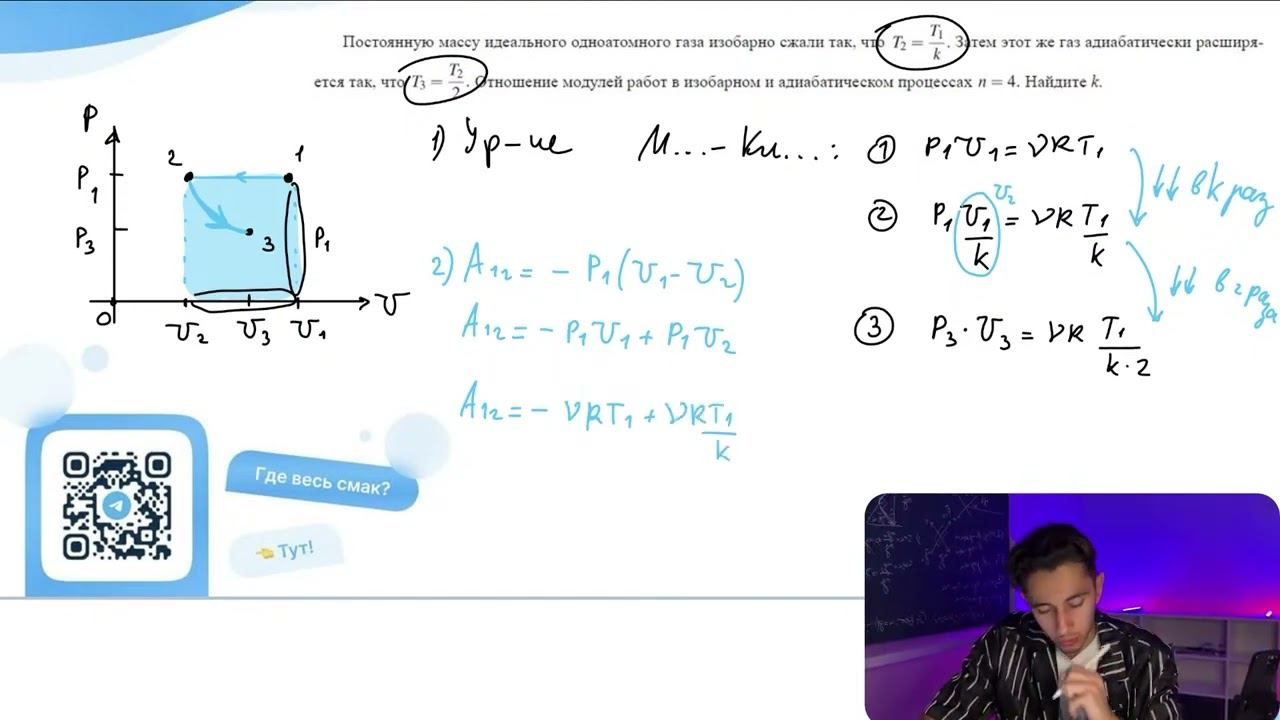 Постоянную массу идеального одноатомного газа изобарно сжали так, что T2 = T1/k. Затем этот - №29715