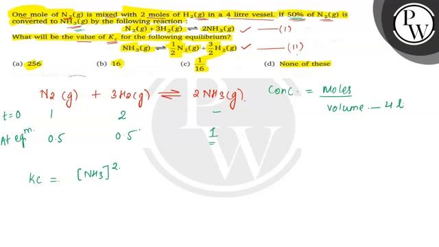 One mole of N_2(g) is mixed with 2 moles of H_2(g) in a 4 litre vessel. If 50 % of N_2(g) is converted to NH_3(g) by the following reaction : N_2(g)+3 H_2(g) ⇌ 2 NH_3(g) What will be the value of K_c for the following equilibrium? NH_3(g) ⇌1/2 N_2(g)+3/2H_2(g) (a) 256 (b) 16 (c) 1/16 (d) None of these 📲PW App Link - https://bit.ly/PW_APP 🌐PW Website - https://bit.ly/PW_APP 📌 PHYSICS WALLAH OTHER CHANNELS : 🌐 PhysicsWallah -Alakh Pandey: https://youtube.com/@PhysicsWallah 🌐 Alakh Pandey: https://youtube.com/@alakhpandey1414 🌐 JEE Wallah: https://youtube.com/@jee_wallah 🌐 Competition Wallah: https://youtube.com/@competitionwallah 🌐 PW Foundation: https://youtube.com/c/PhysicsWallahFoundation 🌐 NCERT Wallah : https://www.youtube.com/channel/UC8zCnnfhz-dvIpVdZ1CheuA 🌐 Defence Wallah-NDA: https://youtube.com/channel/UC8OCoGX9tmMneOzIFUTWq2Q 🌐 PhysicsWallah English: https://youtube.com/@EnglishPW 🌐 PW Vidyapeeth: https://youtube.com/@VidyapeethPW 🌐 Commerce Wallah by PW: https://youtube.com/@commercewallahpw 🌐 CA Wallah bt PW: https://www.youtube.com/channel/UC2amkJX5zDyQJ0mDajAWRSA 🌐 PW Sarkari Exam: https://youtube.com/@PWSarkariExams 🌐 PW - Hindi Medium: https://youtube.com/@physicswallahhindimedium 🌐 PW Bangla: https://youtube.com/@pwbangla 🌐 PW Maharashtra: https://youtube.com/@PWMaharashtra 🌐 PW Telugu: https://youtube.com/@PWTelugu 🌐 PW Kannada: https://youtube.com/@PWKannada 🌐 PW Gujarati: https://youtube.com/@PWGujarati 🌐 PW Facts: https://youtube.com/@pwfacts 🌐 PW Insiders: https://youtube.com/channel/UCHMWQFr9Nwo3wJsAap2Wnfw 🌐 PW Little Champs: https://youtube.com/@pwlittlechamps 🌐 PW Pathshala: https://youtube.com/channel/UCcXUY9NSMyYbkOvUD97CUmA 🌐 Banking Wallah : https://www.youtube.com/channel/UCg5_K50hLTKerLkSE7I1yWQ 🌐 SSC Wallah : https://www.youtube.com/channel/UCcaEVV7A47J4k9GFcqOOYkg 🌐 JEE Challengers by PW : https://www.youtube.com/channel/UCyf71tWV2abeN-l_UKiJ-5g 🌐 UPSC Wallah : https://www.youtube.com/channel/UCqOy6oOu6RPJNHYQ8f_Ybvg 🌐 UPSC Wallah हिन्दी : https://www.youtube.com/channel/UCmrP-DYdZuThp8AO9lnnwNw 🌐 GATE Wallah : https://www.youtube.com/channel/UC9PoSJoftLvEnXT-PtQ5Wtw 🌐 GATE Wallah - EC,EE & CS : https://www.youtube.com/channel/UCuGWIkiNaWjsCqybgxGuxfg 🌐 GATE Wallah - ME, CE & XE : https://www.youtube.com/channel/UCGrrw9x3_B_fItUIBMvqAUw 🌐 GATE English : https://www.youtube.com/channel/UCOsV75fSUr8gnMbhx-Qh3Lg 🌐 College Wallah : https://www.youtube.com/channel/UCDrf0V4fcBr5FlCtKwvpfwA 🌐 PW IIT JAM & CSIR NET : https://www.youtube.com/channel/UCuj28Zll58sztDqLiDhzgtQ 🌐 MBA Wallah : https://www.youtube.com/channel/UCWWEvCschv0T0rtou4VaKGw 🌐 Teaching Wallah : https://www.youtube.com/channel/UCUzqJZOkCejFoc5eqWWA9Eg 📌 PHYSICS WALLAH SOCIAL MEDIA PROFILES : 🌐 Telegram : https://t.me/pwjeewallah 🌐 Facebook : https://www.facebook.com/physicswallah 🌐 Instagram : https://www.instagram.com/pwjee_wallah/?hl=en 🌐 Twitter : https://twitter.com/physics__wallah 🌐 Linkedin : https://www.linkedin.com/company/78087354/admin/ 📌 For any queries or complaints Visit : https://bit.ly/PW_Queries