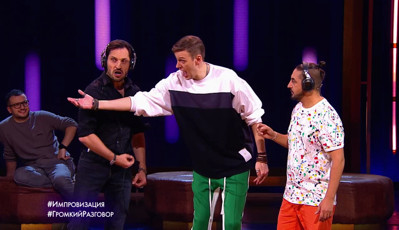 Импровизация «Громкий разговор». Три мушкетера узнали, что Д'Артаньян - гей, но все равно спасают его из плена. Мушкетерам нужно понять в какой из темниц находится Д'Артаньян. Александр Ревва - Атос, Антон Шастун - Партос, Сергей Матвиенко - Арамис, Арсений Попов - Д'Артаньян.