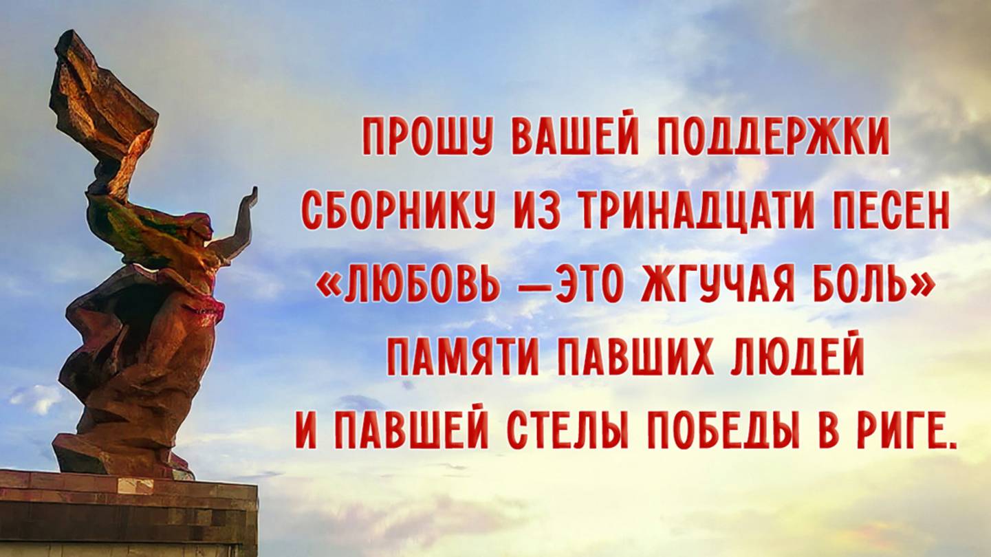 ПРОШУ ВАШЕЙ ПОДДЕРЖКИ СБОРНИКУ ИЗ ТРИНАДЦАТИ ПЕСЕН «ЛЮБОВЬ — ЭТО ЖГУЧАЯ БОЛЬ» ПАМЯТИ ПАВШИХ ЛЮДЕЙ И ПАВШЕЙ СТЕЛЫ ПОБЕДЫ В РИГЕ. • • • KASPARS DIMITERS /010557-10531/ LV63UNLA0001046716777 SWIFT KODS: UNLALV2X https://www.paypal.me/dimiters • • • СБОРНИК ПЕСЕН ИЗ ДЕВЯТИ МОИХ РУССКИХ АЛЬБОМОВ, ПОСВЯЩЁННЫХ ПАВШИМ: 1 ОН ШЁЛ ПО МИННОМУ ПОЛЮ 2 ОТ ЯРОСЛАВЛЯ ДО МОЛИТВЫ 3 ПРИНЦЕССЕ ИЛОНЕ ДОНЕЦКОЙ 4 «СУХОЙ» ОН БЫЛ — ПРИШЁЛ СГОРЕТЬ ЗА НАС 5 ПОЗЫВНОЙ «КУБАНЬ» 6 ТЫ ТОЛЬКО ЖДИ МЕНЯ — БУДУ 7 ПЛАЧ ВЕТЕРАНА-ИНВАЛИДА ЗА ПАВШУЮ БАЛЕРИНУ КАТЮ 8 КОТ КОСТЯ И МЫШОНОК ВЕРОНИКА 9 ДАРЬЯ, ДУШЕНЬКА, ДАША 10 БЕЛГОРОД — БЕЛАЯ ТЬМА 11 ЛИСИЧАНСК — ИКОНКА НЕРОЖДЁННОГО РЕБЁНКА 12 ЖИВ ВОЛК — СТИХИ ЕГО ПЛОТЬ 13 ПОД ПАДАЮЩИМИ ЗВЁЗДАМИ ПОБЕДЫ • • • Памятник-стелу Победы в Риге торжественно открыли 5 ноября 1985 года. Этому монументу, воздвигнутому в честь победы Красной армии над фашистской Германией, смертный приговор был приведён в исполнение 25 августа 2022 года в 16:42. Казнь памятника стала актом осквернения памяти, в том числе 90 000 убитых евреев Латвии. 5 ноября 2025 года памятник-стела Победы мог бы праздновать своё сорокалетие. • • • «Любовь — это жгучая боль. Когда ты весь в чужих ранах и в них соль — Соль твоих невидимых слез С ароматом божественных роз.» • • • kaspars.dimiters@gmail.com +371 25451826 Латвия