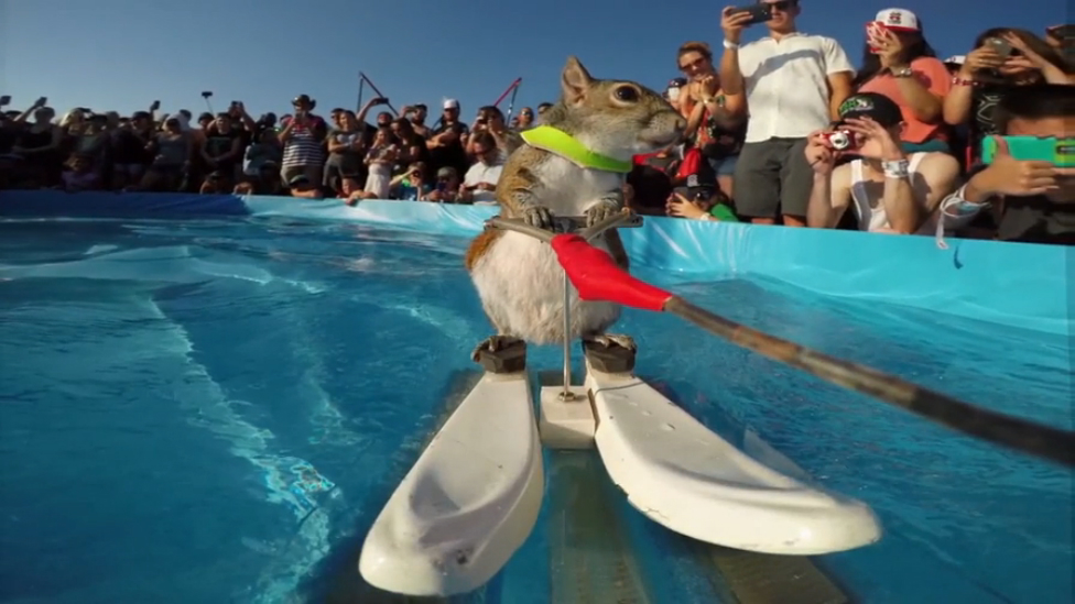 Белка по кличке Твигги показала, как она умеет кататься на водных лыжах.