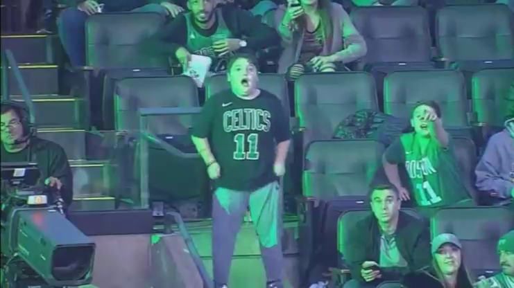 Оператор во время перерыва на баскетбольном матче не захотел показывать мальчика, который оголил майку, но желание болельщика высыпать попкорн себе на голову он не предусмотрел.