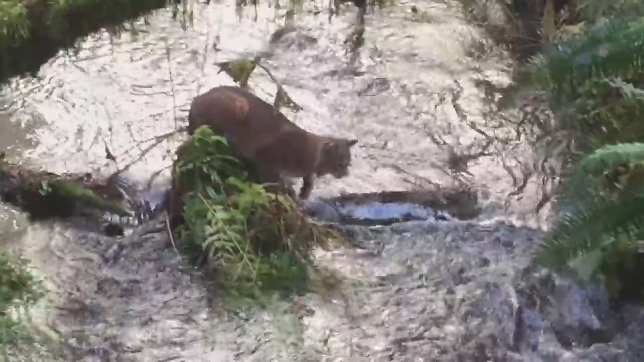 Одна из рейнджеров национального парка «Олимпик» в США отправилась на рыбалку: в это время года нерестится лосось, и, поднимаясь против течения по рекам, очень устает — тут-то его и ловят. Но не только рыбаки: лососем кормятся все крупные хищники окрестных лесов. Возле небольшого моста через речку рейнджер увидела рыжую рысь, которая напряженно выжидала момент для прыжка. Девушке удалось вытащить мобильный и снять редкую сцену на видео. Рысь поймала огромную красную рыбину, длина которой не уступала длине тела самой кошки. Обычно рыси охотятся по ночам, и их очень редко видят в светлое время суток. Сотрудники национального парка предположили, что эта хищница была слишком голодна, чтобы предаваться дневному сну. Голод мог отвлечь ее внимание и от фигуры человека невдалеке. Рыси — очень скрытные животные, и, если бы не пустой желудок, кошка скрылась бы еще до того, как рейнджер успела ее заметить. По видео сотрудники парка определили, что их коллеге встретилась взрослая самка.