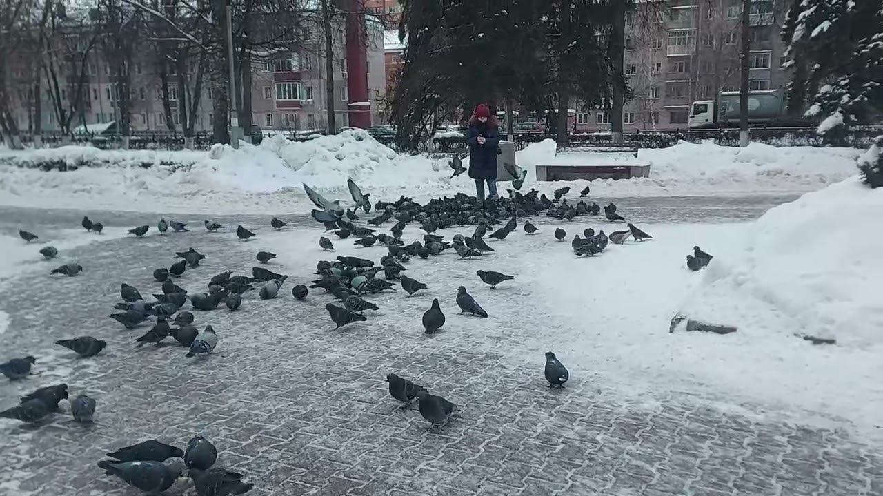 Кормление голубей на аллее 30-летия Победы в Домодедово (02.01.22)