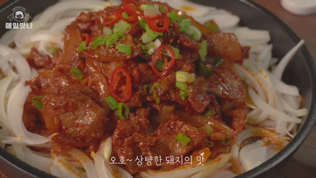 Это блюдо Jeyuk bokkeum по-корейски. Это одно из любимых блюд корейской свинины. Это вкусно, когда едят с рисом. Или есть с овощами. ✤ ингредиенты (2 ~ 3 порции) Свиное бедро 550г, 1 луковица, зеленый лук ✤ Приправа (дозировка рисовой ложки) Соевый соус 2, слива 0,5, олигосахарид 0,5, вкус ликера 1, устричный соус 1, паста из красного перца 1, Тонкий красный перец 1, средний красный перец 1, измельченный чеснок 2, Сахар 1 (когда жареная) Гугл перевод
