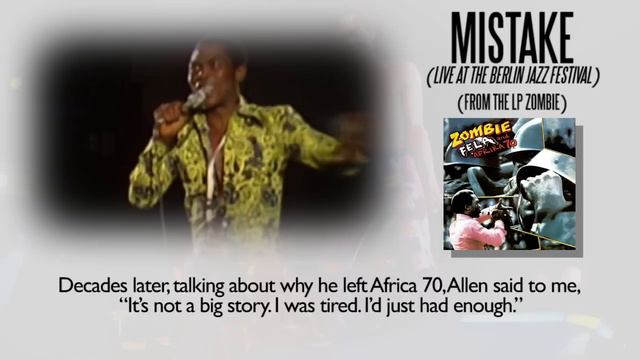 Mistake (1976) Fela Kuti From the LP Zombie (CD release 2001) Subscribe ► https://goo.gl/8Q1pVw & Everybody say "Yeah Yeah" http://fela.net/discography/ This video is part of a series of songs being posted on Fela's official YouTube channel (http://www.youtube.com/fela) each featuring, alongside the music, an informative commentary by Afrobeat Historian, Chris May. The entire catalogue, released on Kntting Factory Records, is available on the Fela website (http://fela.net/), along with documentaries and recorded concerts, CDs and vinyl, tee shirts, posters and many other items.