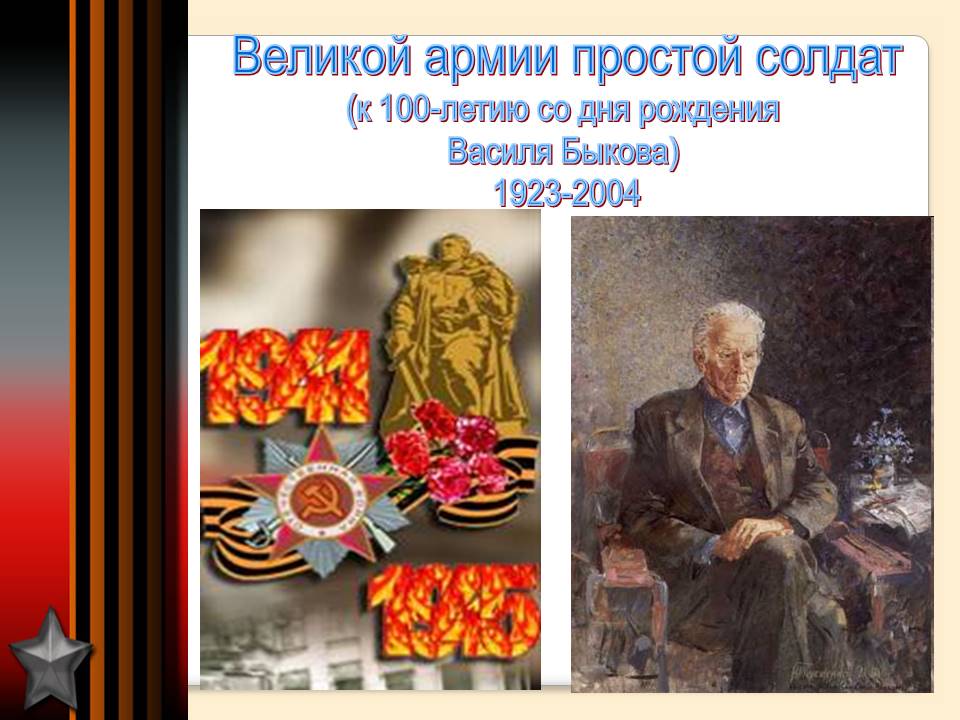 Василий Владимирович Быков родился в 1924 году в крестьянской семье на Витебщине. Когда началась война, Быков обучался в Саратовском пехотном училище ускоренного выпуска. Девятнадцатилетний младший лейтенант отправляется на фронт. Воевал В. Быков на территории Украины, Белоруссии, Румынии, Венгрии, Австрии. Дважды был ранен. Демобилизовался лишь в 1955 году. Первые рассказы В. Быкова были не о войне, а о послевоенной жизни сельской молодежи: «Счастье», «Ночью», «Фруза». В 1956–1957 годах он создает первые военные рассказы и остается верным военной теме в последующих произведениях. К 80-летнему юбилею народного писателя Беларуси Василя Быкова на его родине, в деревне Бычки Ушачского района, была открыта «Усадьба-музей Василя Быкова». Подготовлено главным библиографом Центральной библиотеки г. Анапа Ю. В. Ковалевой.