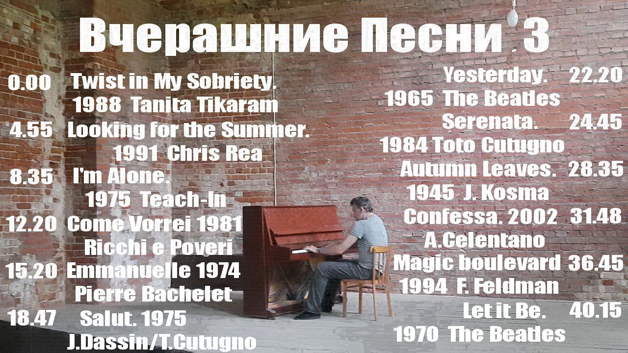 0:00 Twist in My Sobriety 1988 Tanita Tikaram 4:55 Looking for the Summer 1991 Chris Rea 8:35 I'm Alone 1975 Teach-In 12:20 Come vorrei 1981 Ricchi e Poveri 15:20 Emmannuelle 1978 Pierre Bachelet 18:47 Salut 1975 Joe Dassin/ Toto Cutugno 22:20 Yesterday 1965 The Beatles 24:45 Serenata 1984 Toto Cutugno 28:35 Autumn Leaves 1945 Joseph Kosma 31:48 Confessa 2002 Adriano Celentano 36:45 Magic boulevard 1994 François Feldman 40:15 Let it Be 1970 The Beatles Перевод: А.Бобков, А.Бирюков, А.Волков, А.Гаканов, И.Олехова, Я.Старцев, С.Шатров
