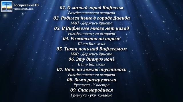 01. О малый город Вифлеем (Рождественская встреча) 02. Родился ныне в городе Давида (МХО - Держись Христа) 03. В Вифлееме много лет назад (Рождественская встреча) 04. Рождество на пороге (Пётр Бальжик) 05. Тихая ночь над Вифлеемом (МХО - Держись Христа) 06. Эту дивную ночь (Пётр Бальжик) 07. Ночь на землю опустилась (Рождественская встреча) 08. Зима раскружила (Русавуки - У костра) 09. Спас народився (Гульчуки - укр. колядка)