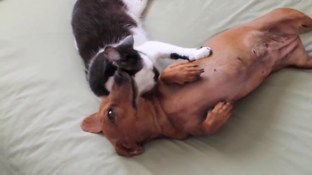 Кот успокаивает собаку