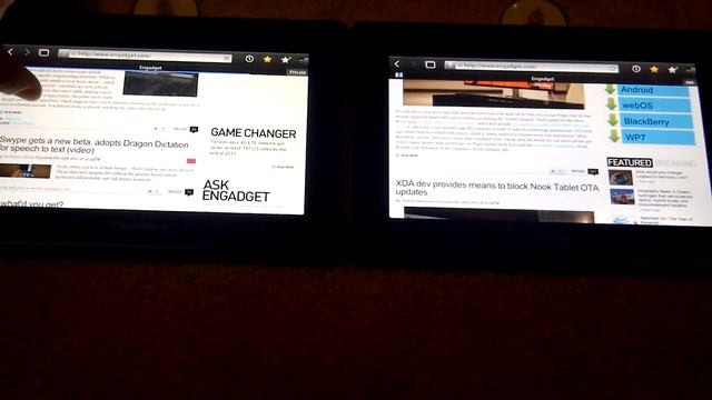 A speed test between the Blackberry Playbook browser on OS 1.0.8.6067 (on the left) and OS 2.0.0.6149 (on the right). OS 2 is the developer build and still in beta. Both Playbook were on the same WiFi. The websites visited were: html5test.com cnn.com engadget.com crackberry.com
