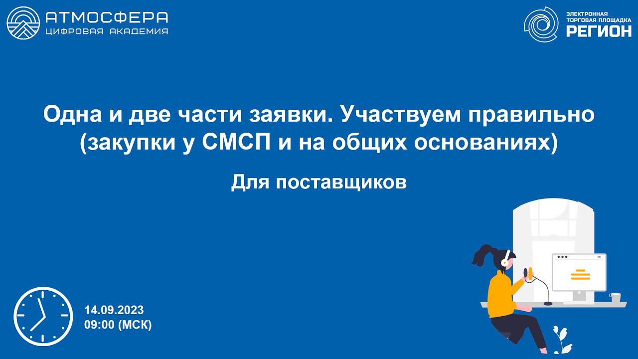 Подписывайтесь на нас в социальных сетях, чтобы не пропустить свежие новости: https://academy-atmosphere.ru/zakupki https://t.me/academy_atmosfera https://vk.com/academy_atmosfera https://rutube.ru/channel/24606397/ 00:00 Вступление 01:23 Приветствие спикера Султанову Лилию Файласовну 01:49 Одна и две части заявки. Участвуем правильно (закупки у СМСП и на общих основаниях) 02:07 Способы закупок 04:05 Конкурентные закупки 08:40 Заявка участника 23:25 Заявка участника ЭК, ЭЗП 50:58 Заявка участника 58:48 Неконкурентные закупки 01:02:26 Ответы на вопросы участников