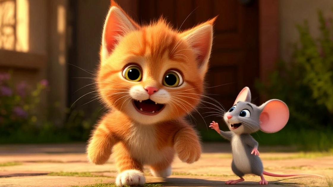 Мультфильм про рыжего котёнка и серого мышонка. Их побег.