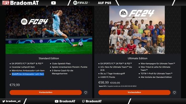 EA FC 24 Ultimate Edition Vorbestellen! Das müsst ihr wissen 😀Darum solltest du noch warten! Das sind die Boni! Nutzt auch EA Play! 1x 10% durch EA Play https://www.ea.com/de-de/ea-play 1x 10% durch FIFA 23 Besitzer https://store.playstation.com/de-at/product/EP0006-PPSA13385_00-24ULTIMATEBUNDLE?et_rid=&et_cid=230713-EAFCANCE-GL-3RD-B-FLX&Linkid=230713-EAFCANCE-GL-3RD-B-FLX https://www.ea.com/games/ea-sports-fc/fc-24/game-offer-and-disclaimers?et_rid=&et_cid=230713-EAFCANCE-GL-3RD-B-FLX&Linkid=230713-EAFCANCE-GL-3RD-B-FLX&emcid=em-3r-471330&isLocalized=true BradomAT - BramBrosTV ist ein österreichischer YouTuber. --------------------------------------------------------------------------------------------------------------------------------------------------------------- Ich streame und uploade hauptsächlich Videos zu FIFA 20, aber auch anderen Spielen wie iRacing.com, ANNO 1400/1800, Age of Empires I/II/III und vielen anderen. Auch Videos zu Magic The Gathering und Lego erscheinen immer mal wieder auf meinem Kanal. Wenn euch meine Videos gefallen, subscribt doch meinen Kanal und gebt mir ein Like :) Kommentare sind ebenfalls immer gerne gesehen :) #BradomAT #eafc #eafc24 --------------------------------------------------------------------------------------------------------------------------------------------------------------- Donate/Spende um dem Kanal zu helfen (TipeeeStream - Wird im Stream eingeblendet): https://www.tipeeestream.com/bradom-at/donation --------------------------------------------------------------------------------------------------------------------------------------------------------------- Bei Amazon Kaufen und den Kanal damit unterstützen: FIFA 20 bei Amazon kaufen: https://amzn.to/2HToR5q FIFA 20 Points:https://amzn.to/2UEXxwS Supporte den Kanal wenn du XBox Live oder Playstation Plus verlängerst: XBOX LIVE GOLD 12 Monate - http://amzn.to/2pQ9iCU Playstation Plus 12 Monate - http://amzn.to/2pjUQj0 XBOX Guthaben - https://amzn.to/2OT7zqa PSN Guthaben - https://amzn.to/2PtNojC XBOX GamePass Ultimate: https://amzn.to/31ffGUJ XBOX GamePass: https://amzn.to/2ZLev2i --------------------------------------------------------------------------------------------------------------------------------------------------------------- Ausserdem könnt ihr mir auch auf Facebook/Twitter, Twitch und Co folgen: YouTube: https://www.youtube.com/c/BradomAT Twitch: https://www.twitch.tv/BradomAT Mixer: https://www.mixer.com/BradomAT Facebook: https://www.facebook.com/BradomAT Twitter: https://twitter.com/bradom_at Instagram: https://www.instagram.com/bradom_at/ BrickBradomAT: https://www.youtube.com/channel/UCgNQpch50I98IQuBTNe4g-Q --------------------------------------------------------------------------------------------------------------------------------------------------------------- Join iRacing: https://members.iracing.com/membersite/SubscriptionChoices.do?refid=186285 --------------------------------------------------------------------------------------------------------------------------------------------------------------- German / Deutsch --------------------------------------------------------------------------------------------------------------------------------------------------------------- Multistreaming with https://restream.io/ --------------------------------------------------------------------------------------------------------------------------------------------------------------- Mein PC: Bildschirme * [Asus ROG PG348Q](http://amzn.to/2iMuQy7) * [Benq XL2411Z](https://amzn.to/2N4xrT4) Grafikkarte * [ASUS GTX 1080 A8G](http://amzn.to/2hBSInU) SSD * [SAMSUNG 860 EVO 500 GB](https://amzn.to/34uY2hB) * 128 GB Samsung 830 PRO CPU * [i7-4770K] * [16 GB RAM] Sonstiges * Windows 10 Anniversary 64Bit Lenkrad * [Thrustmasters TX 458 Italia - XBOX ONE / PC] Sound * [Logitech G35 (Headset)] * [Logitech Z623](https://amzn.to/2ZNnSxR) Mikrofon * [Rode NT-1A](https://amzn.to/2ZHPQvO) ---------------------------------------------------------------------------------------------------------------------------------------------------------------