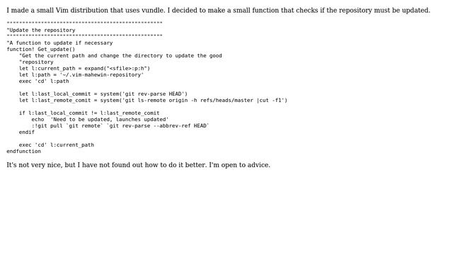 Code Review: Checking if a git repository needs to be updated Helpful? Please support me on Patreon: https://www.patreon.com/roelvandepaar With thanks & praise to God, and with thanks to the many people who have made this project possible! | Content (except music & images) licensed under CC BY-SA https://meta.stackexchange.com/help/licensing | Music: https://www.bensound.com/licensing | Images: https://stocksnap.io/license & others | With thanks to user Jamal (codereview.stackexchange.com/users/22222), user Hobbestigrou (codereview.stackexchange.com/users/28261), user 200_success (codereview.stackexchange.com/users/9357), and the Stack Exchange Network (codereview.stackexchange.com/questions/30097). Trademarks are property of their respective owners. Disclaimer: All information is provided "AS IS" without warranty of any kind. You are responsible for your own actions. Please contact me if anything is amiss at Roel D.OT VandePaar A.T gmail.com