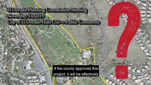 General Manager of El Dorado Hills Community Services District (EDHCSD), Kevin Loewen was invited by Chairman Gary Miller to speak on behalf of the community he represents at the first of four Planning Commission Meetings regarding the former Executive Golf Course. EDHCSD has captioned and published the public comment portion from the first Planning Commission meeting held on November 14, 2019, so that residents not in attendance can have more insight into what their CSD has to say on their behalf, as well as know what neighbors were commenting on at the meeting. Link to the November 14, 2019 Planning Commission Meeting's audio and Agenda and Minutes - Draft: http://eldorado.granicus.com/MediaPlayer.php?view_id=2&clip_id=1285 EDHCSD Board and Leadership continue to echo the voice of our community to maintain the Old Executive Golf Course as a recreation open space resource. As you will find in the link below, EDHCSD has made several formal and informal requests to obtain exactions above and beyond the basic legal requirements for the Developer's project application. Those attachments can be found in the CEDHSP Draft Development Agreement - CSD Board Letter to the County: https://eldoradohillscsd.org/images/parks/Executive_Golf_Course/development_agreement.pdf