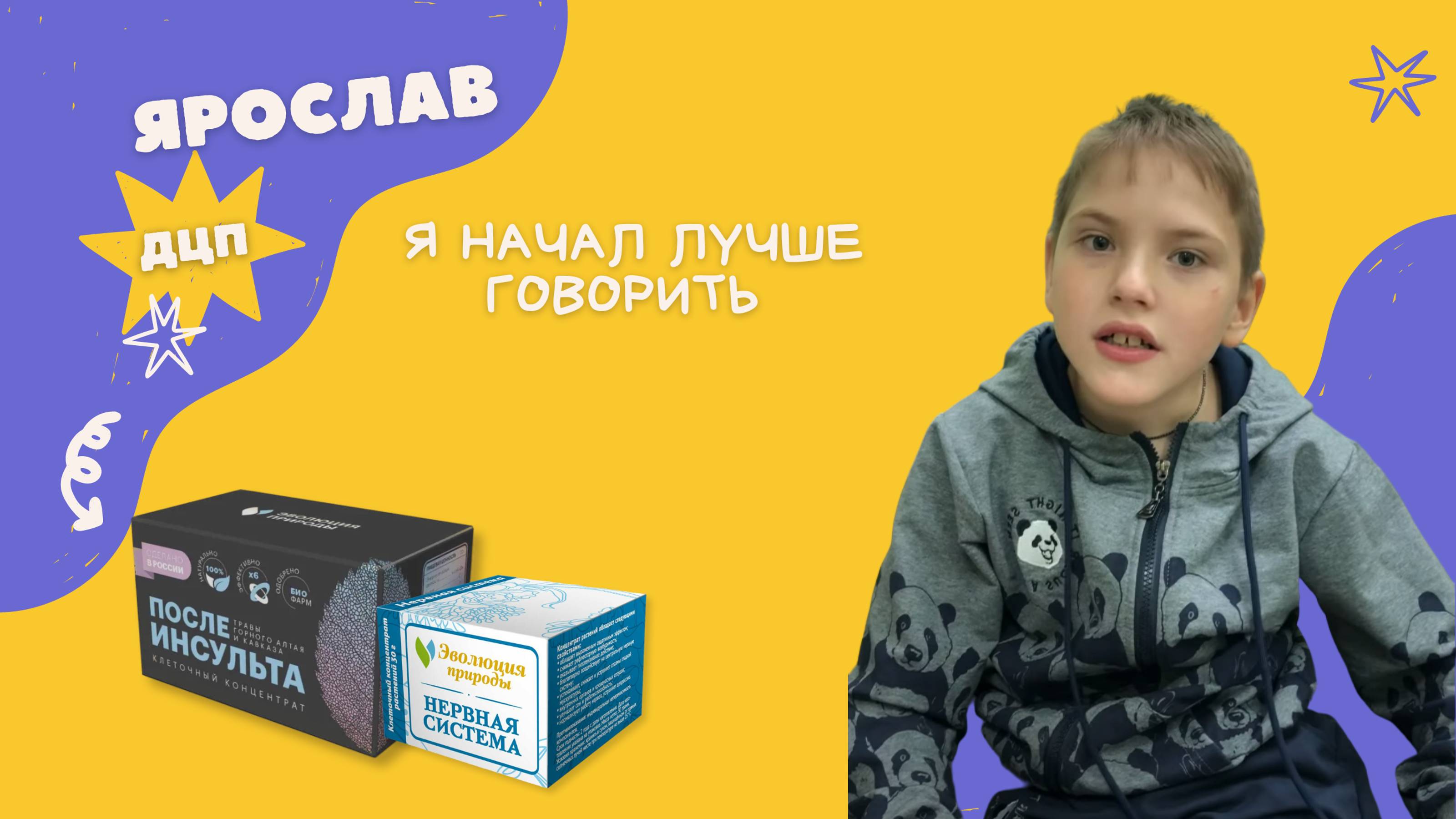 "Здравствуйте я мама Ярослава, Ярославу 9 лет диагноз у него ДЦП пластическая форма, то есть у нас повышенный тонус во всех конечностях. Мы месяц принимаем вот эти препараты "Нервная система" и "После инсульта" по мерной ложке, два раза в день. У нас за месяц произошли такие изменения, Ярославка показывай! Я могу бить пяткой, он раньше никогда не делал он всегда на носочках. Дальше, ручки покажи, что ты можешь делать ручками (а вместе? а вот так) У нас распрямились пальчики, вот видите! У ребенка свободно пальцы встали! Он более подвижный стал у нас! Более активный стал! Изменения и школьной программе у нас успехи пошли большие, да? - Хм! Нас хвалят и по математике и ребенок начал сам пытаться писать в тетради. - Да еще вы говорили, что он даже один раз смог сам одеться? - Да, у нас с ним был конфликт. Я сказала я не буду тебя одевать, ушла и он сам самостоятельно оделся полностью. Одел трусики, штанишки школьные - Что еще было у тебя? - Водолазка у нас была, правда без пуговиц - Рубашка была – Нет, водолазка была, и носочки он одел. - Я правильно понял, что у нас изменения по опорно-двигательной функции, по психике у нас изменения и вот я даже вижу что он активнее, и быстрее реагирует и возможно новые слова? - Да у нас слова и новые реакции у ребенка. Изменения идут в положительную сторону, поэтому мы, принимая всего один месяц будем продолжать принимать препарат "Эволюции природы" Будем надеяться наш мальчик пойдет, до победного! - Ярослав расскажи, пожалуйста, какие у тебя изменения? - Добрый день! - Привет! - Что у тебя улучшилось? Когда ты начал пить наши концентраты, расскажи? - Ну я начал пить "После инсульта" и "Нервная система" да- Какие изменения? Что улучшилось за этот месяц? Вот нога так начала двигаться, да? - Ножки улучшились - Ножки стали лучше двигаться, да? А покажи ручки тоже стали лучше двигаться? - Да! - А что еще, какие изменения? Улучшения? - Есть! - Расскажи какие? - Я начал лучше говорить - Ну здорово! Молодец! Спасибо Ярослав! 2 неделя:...Он еще заваливается, но спину начал держать это радует!" https://эволюция-природы.рф/company/articles/405/