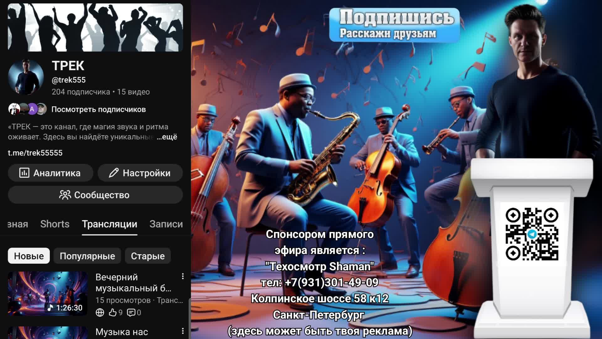 «ТРЕК — это канал, где магия звука и ритма оживает. Здесь вы найдёте уникальные музыкальные композиции, авторские ремиксы и волшебные мелодии, чтобы вдохновить ваше воображение». Спонсором прямого эфира является компания "Техосмотр Шаман которая находится за адресом : Санкт-Петербург Шушары Колпинское шоссе дом 58 к12 стр.1 тел : +7(931)301-49-09 Сайт : https://gtocentr-shaman.ru #трек #музыкадлядуши #музыка2019 #музыкантынасвадьбу #музыка #музыкавмашине #музыкавдуше #музыкакавказа #топмузыка #музыкальнаягруппа #intags #ретромузыка #музыкальныймагазин #живаямузыка #музыкажизнь #музыкадуши #музыкант #музыкальная #музыкадлядуши #музыка2020 #музыкавмашину #любимаямузыка #музыкальныймобиль #музыкальный #музыканты #музыкальныеигрушки #музыка2018 #музыканассвязала #хорошаямузыка #бременскиемузыканты #попмузыка