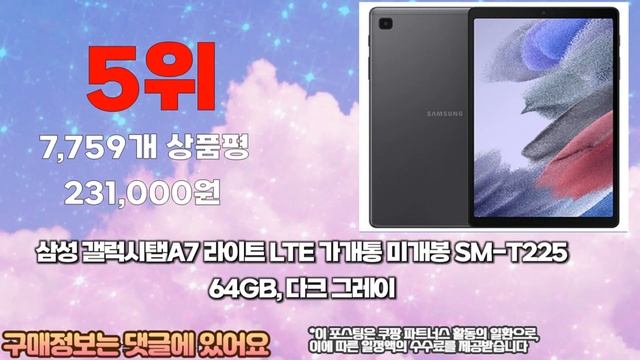 ❤️❤️❤️ 겔럭시탭a7 구매 가격 평점 리뷰 정리해 봤어요! ❤️❤️❤️ 상품 구매 및 상세한 정보는 더보기 또는 고정댓글 참고해 주세요. ▼▼▼▼▼▼▼▼▼▼▼▼▼▼▼▼▼▼▼▼ [00:06] 10위. #라잇굿즈 갤럭시탭 A7 10.4인치 에바폼 케이스 SM-T500 [14,900원] ?구매링크?https://link.coupang.com/a/bo9E2D [00:11] 9위. #삼성 갤럭시탭 A7 Lite 8.7인치 SM-T220NZSAXAR 32GB [165,900원] ?구매링크?https://link.coupang.com/a/bo9E4F [00:17] 8위. #삼성 갤럭시탭 A7 Lite SM-T220 WiFi 32GB [210,000원] ?구매링크?https://link.coupang.com/a/bo9E6D [00:22] 7위. #삼성전자 갤럭시탭A7 Lite 8.7 SM-T225 LTE 64GB [249,000원] ?구매링크?https://link.coupang.com/a/bo9E8s [00:28] 6위. #삼성전자 갤럭시탭 A7 Lite 8.7 WiFi 32GB [215,000원] ?구매링크?https://link.coupang.com/a/bo9Fae [00:33] 5위. #삼성 갤럭시탭A7 라이트 LTE 가개통 미개봉 SM-T225 [231,000원] ?구매링크?https://link.coupang.com/a/bo9Fbl [00:39] 4위. #삼성전자 갤럭시탭A7 Lite 8.7 SM-T220 WiFi전용 32GB [210,000원] ?구매링크?https://link.coupang.com/a/bo9FdL [00:44] 3위. #삼성 갤럭시탭 A7 Lite SM-T220 WiFi 32GB [224,000원] ?구매링크?https://link.coupang.com/a/bo9FfK [00:50] 2위. #삼성 갤럭시탭A7 10.4 SM-T500N 64GB 64기가 WiFi/LTE [209,000원] ?구매링크?https://link.coupang.com/a/bo9FhY [00:55] 1위. #삼성전자 갤럭시탭 A7 Lite 8.7 그레이 32GB [210,000원] ?구매링크?https://link.coupang.com/a/bo9Fjz 이 포스팅은 쿠팡파트너스 활동의 일환으로, 이에 따른 일정액의 수수료를 제공받습니다.
