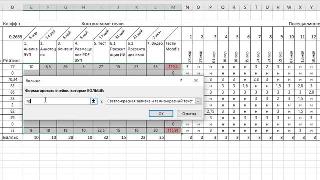 Создание правила условного форматирования - выделение ячеек с оценками