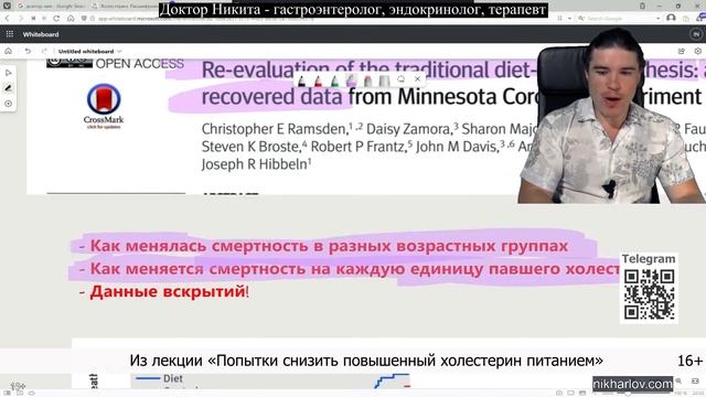 Научное снижение холестерина полиненасыщенными жирами: Миннесотское коронарное исследование. Как наука пыталась снизить холестерин питанием полиненасыщенными жирами. Исследование длилось четыре с половиной года на 4393 мужчинах и 4664 женщинах. Контрольная группа получала 39% жиров, из них 18% насыщенных животных, 5% полиненасыщенных растительных масел, 16% мононенасыщенных жиров. Исследуемая группа: 38% жиров, из них 9% животных, 15% растительных (омега 6), 14% мононенасыщенных жиров. Это в 2 раза меньше жиров животных и в 3 раза больше растительного масла чем у контрольной группы. Проверялось влияние питания на инфаркт миокарда, и смертность от всех причин. По случаям сердечно сосудистых заболеваний за 4 года различий между группами не было. По смертности от любых причин количество выживших на контрольной диете оказалось выше, и чем длиннее период жизни, тем выше различие, начиная с полутора лет. Впоследствии была сделана переоценка результатов для проверки гипотезы влияния диеты на сердечно сосудистые заболевания. Переоценка касалась: (1) смертность в зависимости от возраста, (2) изменение смертности на каждую единицу сниженного холестерина, и (3) вскрытие умерших. Смертность от любых причин росла с ростом возраста и в большей степени в группе с растительными маслами. Женщины от них умирали чаще. В группе менее 65 лет существенной разницы между животными и растительными жирами омега 6 не было. Чем старше после 65 лет, тем выше смертность, и в группе с питанием растительными маслами она оказалась намного выше чем в контрольной. Ранее предполагалось, что риск инфаркта миокарда будет меньше с питанием растительными маслами, подтвержденный вскрытием после смерти. И будет меньше прогрессирующего атеросклероза сосудов. Однако результаты вскрытия показали, что 41% из тех, кто потреблял растительные масла, имели как минимум один инфаркт миокарда. У контрольной группы, в которой люди потребляли больше животных жиров, только у 22% был инфаркт миокарда. Получается, что в группе с бóльшим количеством полиненасыщенных растительных жиров было в два раза больше инфарктов миокарда. Это подтверждается результатами вскрытия. Так что жиры омега 6, несмотря на то, что снижают холестерин в крови, не показывают полезность для снижения смертности. Больше умирают старше 65 лет, и больше женщин. И что самое интересное – на каждые 0,78 ммол/литр снижения холестерина риск смертности увеличивается на 22%. Питание с большим количеством растительных жиров никакого преимущества не даёт. Исследовано влияние жиров на организм. #ЖирыСмертность #СмертностьПричины #ЖирНасыщенный #ЖирНенасыщенный #ЖирПолиненасыщенный #БолезниСердечноСосудистые #МаслоРастительноеИнфаркт ===== Информация в данном видео предоставлена для ознакомления и