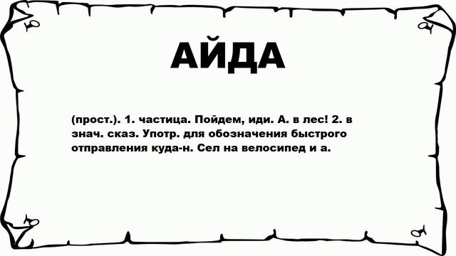 Хочешь знать что значит АЙДА? тогда слушай до конца. (прост.). 1. частица. Пойдем, иди. А. в лес! 2. в знач. сказ. Употр. для обозначения быстрого отправления куда-н. Сел на велосипед и а. Больше слов: #слова #словарьрусский #значениеслов