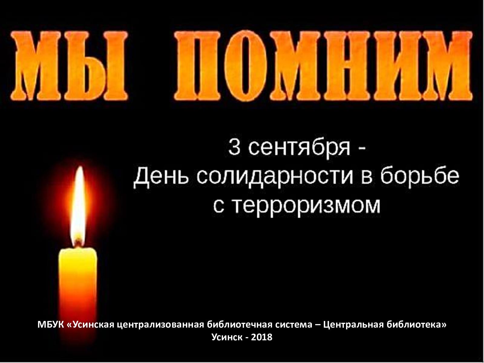 День солидарности в борьбе с терроризмом отмечается в России ежегодно 3 сентября. Эта дата была установлена после трагических событий, произошедших в Беслане в 2004 году. От террористического акта погибли свыше трех сотен человек. В этот день принято вспоминать всех, кто погиб от террористических акций. Об этом забывать нельзя! О трагедии в Беслане наш час памяти «Беслан, мы помним о тебе!». Подготовлено главным библиотекарем Ивановской сельской библиотеки-филиала№15 Н.А. Варфоломеевой