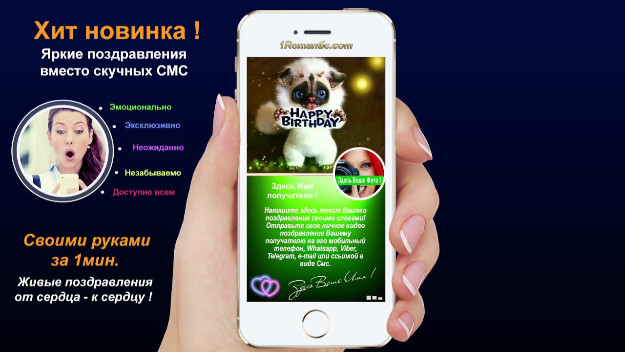 ЗАПОЗАПОЛНИТЬ ЭТУ ОТКРЫТКУ СВОИМИ СЛОВАМИ СЕЙЧАС: https://1romantic.com/musicalnye-pozdravleniya/potseluy/ Дорогие друзья! Вам остаётся только, написать нужный вам текст и загрузить свою фотографию. 1Romantic.com Является первым и единственным в мире сервисом интерактивных видео поздравлений. Мы используем собственную уникальную технологию, добавляя ежедневно самые новые и последние разработки программирования. У нас Вы можете найти поздравления на любой вкус, только высокого качества и разрешения. Согласитесь, всегда приятней, отправить поздравления от себя лично, чем пересылать чужие, с уже заготовленным стандартным и быстро мерцающим текстом, как рекламный баннер, пересылаемый друг-другу от тысячи к тысячам где нет Ваших Имён. Задумайтесь ! Это выглядит слишком наивно и как минимум глупо, особенно для людей которые умеют писать и читать (на мою розочку сверкалку или стикер и отвали). Теперь всё будет иначе ! Вы можете сами передать своё настроение, тем людям, которым Вы будете адресовать своё поздравление. Теперь Вы сами, творец, художник и поэт своих чувств, наполняя видео открытку своими словами, излучая только самое доброе, искреннее из своих тёплых сердец. Загрузить свою любимую фотографию или фотографию получателя, что безусловно, будет гораздо приятней и неожиданней для него) Безусловно, мы подумали и о музыкальном оформление. Наверняка, Вы будете подбирать нужные слова и фотографию под ту песню, которую Вы захотите загрузить сами, а не ту которую Вам навязывают. Ну и самое главное, Вы можете использовать функцию добавления своего голоса, программа сама наложит Ваш голос на начало загруженной песни. Поверьте это очень оригинально, особенно если Ваш друг не слышал Вас долгие годы. Такое поздравление можно сделать действительно за 30-60 сек. Но если Вы творческий человек, оно не отпустит Вас так быстро))) И Вы будете думать, сочинять, плакать, улыбаться, восхищаться, раскрыв в себе новые таланты... возможно это станет Вашим первым собственноручным творением . Удачи Вам ! С уважением, Ваши Романтики ! Краткий список предлагаемых нами поздравлений... Поздравления с днем рождения женщине. Поздравления с днем рождения мужчине. Поздравления с днем рождения другу. Поздравления с днем рождения подруге. Поздравления с днем рождения для детей. Поздравления с днем святого Валентина. Поздравления Папе. Поздравления с днем рождения Маме. Прикольные поздравления. Видео поздравления с днем рождения. Музыкальные поздравления с днем рождения. Слайд-шоу с днем рождения. и многое-многое другое.