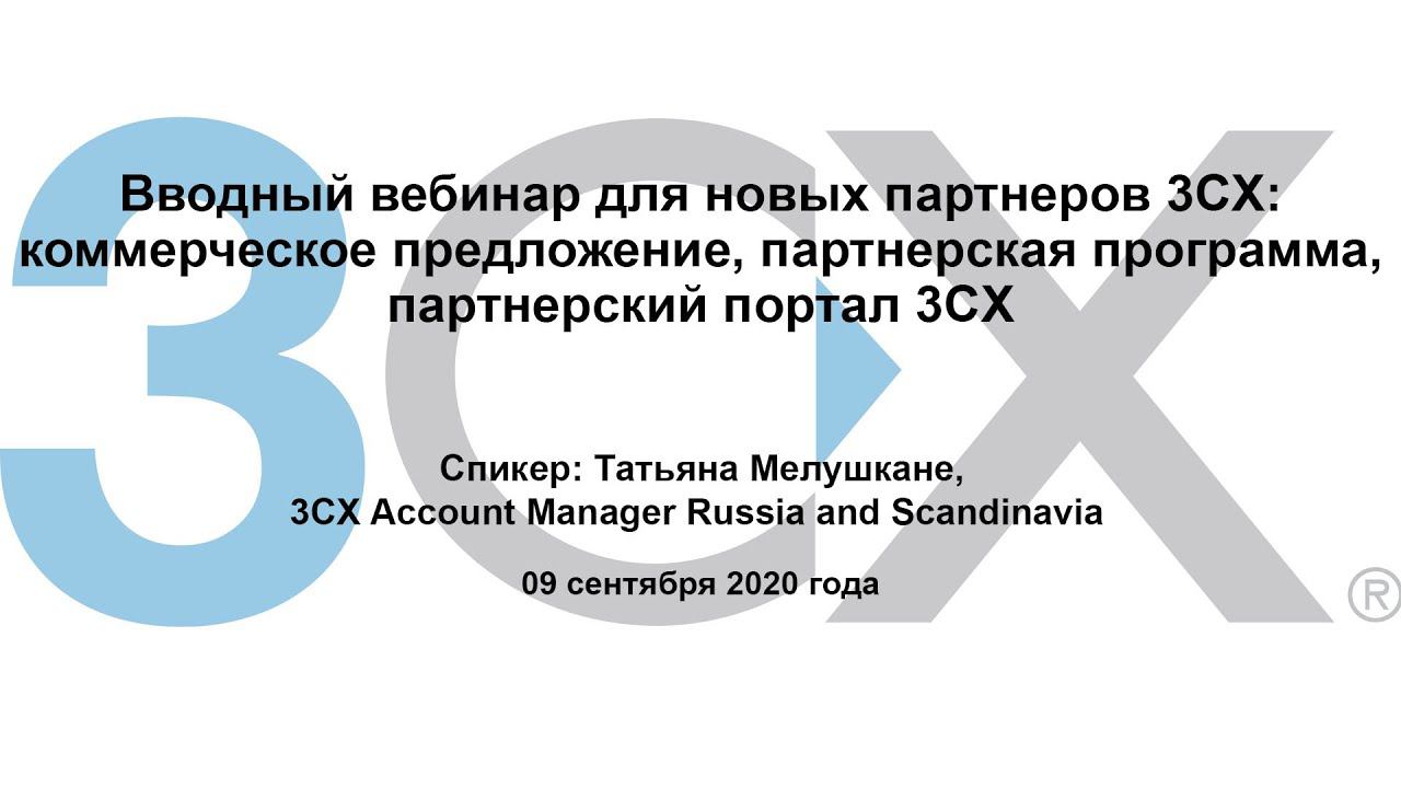 09 сентября 2020 года состоялся первый вебинар из серии коммерческих вебинаров компании 3СХ на русском языке. Этот вводный вебинар для новых партнеров 3CX посвящен созданию "продающих" коммерческих предложений, партнерской программе и партнерскому порталу 3CX. Начиная с 09 сентября 2020 года бесплатные вебинары будут проходить каждую среду в 10:00 (МСК). Спикер: Татьяна Мелушкане, 3СХ Account Manager Russia and Scandinavia
