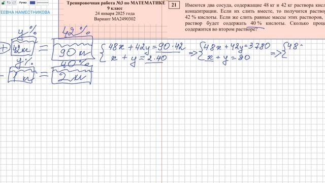 ФИПИ ОГЭ Тренировочная работа по математике 9 класс 24 января 2025 года Вариант МА 2490302 Задание 21 Имеются два сосуда содержащие 48 кг и 42 кг раствора кислоты различной концентрации слили их слить вместе то получится раствор содержащий 42 кислоты слить же слить равные массы этих растворов то полученный раствор будет содержать 40 кислоты Сколько процентов кислоты содержится во втором растворе