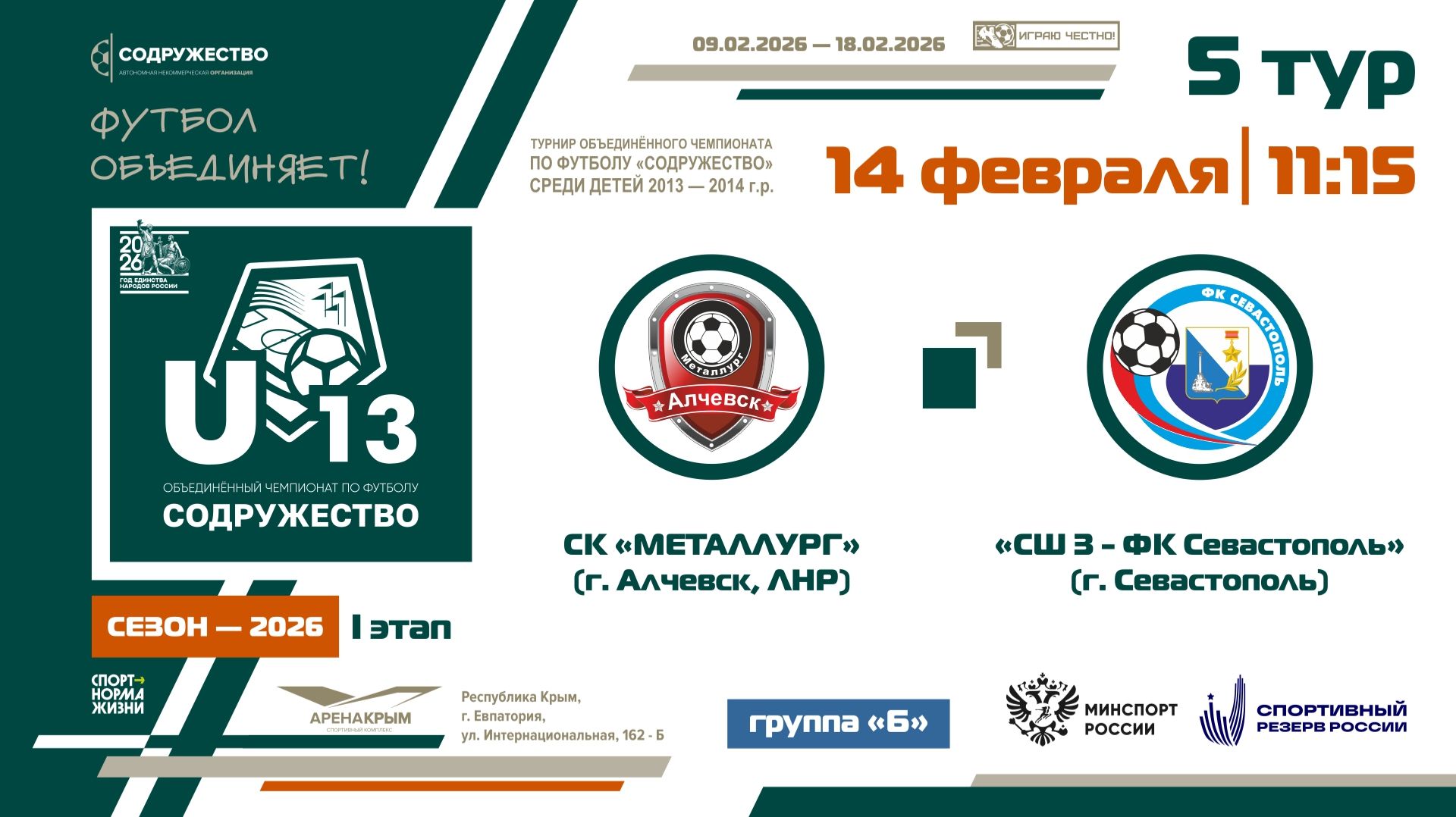 5 ТУР [Группа Б] | СК "Металлург" (Алчевск) - СШ №3-ФК «Севастополь» (Севастополь) | 14.02.2026