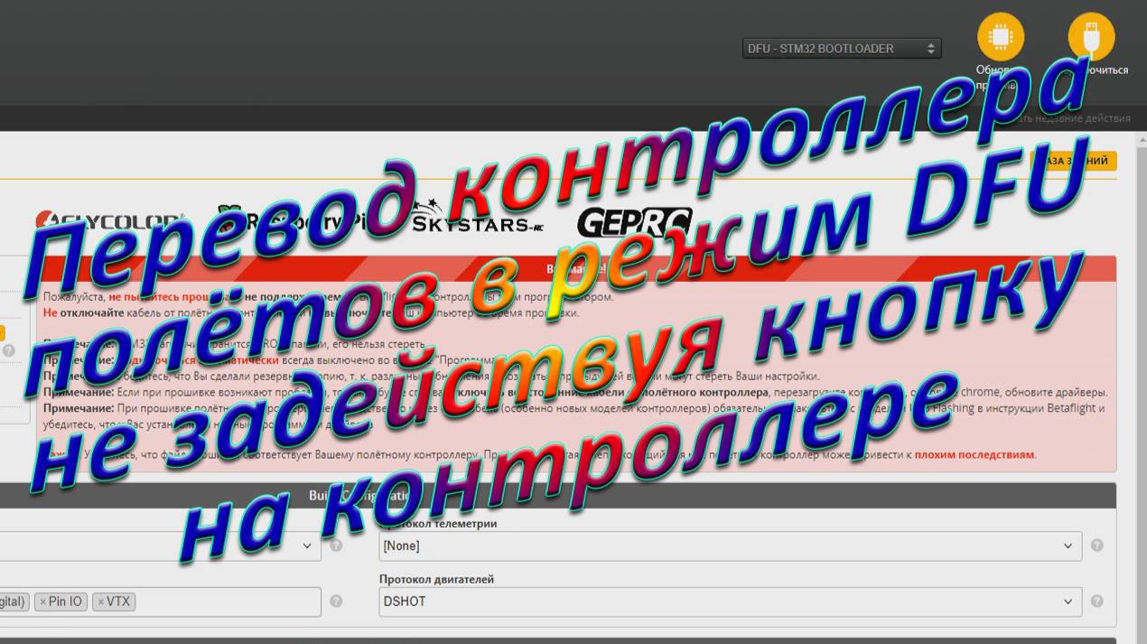 Если неисправна кнопка DFU как перевести контроллер полётов в режим програми-рования контроллера не задействуя кнопку DFU ▼▼▼▼▼▼▼▼▼▼ Внимание! Все ссылки ознакомительные и не являются рекламой. Поддержите канал на Rutube https://rutube.ru/channel/24101577/ любой суммой Video – shoper.ru - https://codeaven.com/g/1zr76rz6gq0f9a7302bf7c586e2bf0/?erid=LatgBeyKB Зарабатывай в сети с Admitad https://www.admitad.com/ru/promo/?ref=lf00yxn8o8 Верни деньги до 8,5 % https://alibonus.com/?u=655330 ПОДПИШИСЬ на Rutube https://rutube.ru/channel/24101577/ на Яндекс Дзен https://clck.ru/e4sEe ▼▼▼▼▼▼▼▼▼▼▼▼ Ролики по теме: - https://clck.ru/Tjar6 ▼▼▼▼▼▼▼▼▼▼ Цифра Dji O4 Air Unit Pro https://fas.st/UOA_L Dji O4 Air Unit https://fas.st/qFHzz https://fas.st/iZxRO Очки Goggles3 dji https://fas.st/BfPAag Шлема Goggles n3 dji https://fas.st/Ftcuna АППАРАТУРА Карманный Radiomaster https://fas.st/DPF4hU Flysky FS-i6 https://ali.ski/Rc43nq RM TX16s https://fas.st/pE_wOP RM TX12 https://fas.st/WY9lo TANGO 2 https://fas.st/mNWfg РАМЫ для КОПТЕРОВ Комплект рам XL5/6/7/8/9 https://fas.st/sCayha FlyFishRC VD5 https://fas.st/1gPUU APEX Mini 3 https://fas.st/MsWt5 Mark4 https://fas.st/s-RLI Модуль питания APM https://fas.st/qaurC СИЛОВАЯ УСТАНОВКА 2207 https://fas.st/We9nMI 2306 https://fas.st/0Ijrq 1604 https://fas.st/SD2Fb 1404 https://fas.st/0qn8s 1103 https://fas.st/8nqFl 2212 + Esc https://ali.ski/xmdUzs https://ali.ski/fkzhmn Регуль 40А 4в1 https://fas.st/lZJDEe 30АBLHeli https://ali.ski/n2KdAu 30ASim с беком на 5в https://fas.st/4Zelrj ПРОПЕЛЛЕРЫ Проп 7042 https://fas.st/dKBOB Gemfan 2023 https://fas.st/NVyXvY Gemfan 3028 https://fas.st/nHHXK HQ 3,5 дюйма https://fas.st/ldcFh HQ Prop 4 "5" 6 " https://fas.st/zP3LIX HQPROP 7X4X3 https://fas.st/PgY3y КОНТРОЛЛЕРЫ JHEMCU GHF405 https://fas.st/508CfZ SoloGood F405 55A https://fas.st/atotd0 MAMBA F405 https://fas.st/Ii_2kL SpeedyBee F405 Mini https://fas.st/Q5M6P5 SpeedyBee F405 V3 https://fas.st/KA5Pn3 ПЕРЕДАТЧИКИ УПРАВЛЕНИЯ Crosfaer ПРД https://fas.st/fUSFr ExpressLRS ELRS https://fas.st/zDZDpD ПРИЁМНИКИ УПРАЛЕНИЯ Crossfire https://fas.st/zDZDpD Flysky https://fas.st/5ULmD Fli14 https://fas.st/K-dHVb FPV АНАЛОГ Очки SKYZONE https://fas.st/p8v70R SKYZONE COBRA https://fas.st/cwn7P FPV-монитор https://fas.st/0c2Zx КАМЕРЫ FPV RunCam split 4 https://fas.st/jvnMD RunCam Phoenix 2 https://fas.st/m1ke1 Foxeer Predator https://fas.st/4c4zQ8 Foxeer Razer https://fas.st/xNNg0Q FPV ПЕРЕДАТЧИКИ AKK FX2 – https://fas.st/iBiz_U AKK+DVR https://fas.st/ETL8sb АКК на 3000мвт https://fas.st/n368oC TX805 на 25/200/600/800 https://ali.ski/lf01YT TBS UNIFY PRO https://fas.st/Q8JmF- БАТАРЕИ Батарея для TX16s https://fas.st/j6YkMI 3-6S Tattu https://fas.st/pFc4To 4-6S Tattu https://ali.ski/SwTrWv OVONIC Lipo - 4S https://fas.st/tr8Su0 HRB Lipo https://fas.st/38vQc 18650 https://fas.st/fCklMK Батарея 21700 https://fas.st/37yEBK https://fas.st/es_LPM Cумка АКБ противопожарная https://fas.st/765Z7Y ЗАРЯДКА ToolkitRC https://fas.st/1xCODx UP60AC https://fas.st/E4G1wK Imax B6 https://fas.st/gCY4xV Imax B3 https://fas.st/nwIf-g ПРИЁМНИКИ GPS GPS-модуль MATEK https://fas.st/eo8cT Walksnail WS-M181 https://fas.st/cLs64 BN- 220 https://fas.st/_8vtn GPSтрекер авто https://fas.st/10Xx3 ПОИСКОВИКИ Пищалка автономная https://fas.st/6e-ZfS САМОЛЁТЫ КРЫЛЬЯ Reptile S800 https://fas.st/cdo6v ДЛЯ САМОЛЁТОВ КРЫЛЬЕВ Сервы https://ali.ski/rdS_EM Пропы https://ali.ski/eWkZrM Цанговый зажим 2-10 https://ali.ski/TluTmY НАСТРОЙКА КОНТРОЛЬ Сервотестер https://ali.ski/cRD_sL Индикатор заряда https://fas.st/lIOE1 ИНСТРУМЕНТ Отвертка электрическая https://fas.st/qUfIx Xiaomi Отвертки https://ali.ski/0vUAU Скальпель https://fas.st/YlYUZ Термолента https://fas.st/qIaze ПАЯЛЬНИКИ SH72 https://ali.ski/Jt2s2Q TS 101 https://fas.st/XocWa Припой https://ali.ski/8H3pKs Флюс https://ali.ski/WUMuM КОМПЛЕКТУЮЩИЕ Запчасти Для TX16S https://fas.st/Ko8UX Ручка складная https://fas.st/0fGYUm Ремешок TX16S https://ali.ski/DUV2eu Батарейный ремешок https://fas.st/EZnkI Рюкзак FPV https://fas.st/VpFlP Разъем XT30,XT60,XT90 https://ali.ski/rnBeC