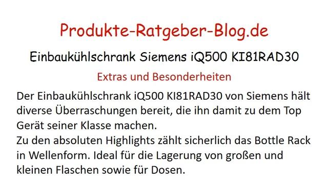 Zum Testbericht von Einbaukühlschrank Siemens iQ500 KI81RAD30 https://www.produkte-ratgeber-blog.de/testberichte/test-einbaukuehlschrank-siemens-iq500-ki81rad30.html Informieren Sie sich hier zum großer Einbaukühlschrank Test https://www.produkte-ratgeber-blog.de/einbaukuehlschrank-gross-test-vergleich.html Fazit des Einbaukühlschrank Test mit dem Siemens iQ500 KI81RAD30: Der Siemens Einbaukühlschrank iQ500 KI81RAD30 verdiente sich in unserem Einbaukühlschrank Test völlig zurecht die Note "Sehr gut". Das Gerät bietet jede Menge Platz in seinem Innenraum und wartet mit einer perfekte Verarbeitung auf. Zahlreiche Extras sowie eine optimale Handhabung sind genau die Attribute die ihn zu einem absoluten Top Einbaukühlschrank machen. Der iQ500 KI81RAD30 von Siemens bietet einfach alles, was ihn zu einem perfekten Partner in einem Mehrpersonen-Haushalt macht. Kein Wunder also, dass er durch diese Leistung zum Einbaukühlschrank Testsieger seiner Klasse gewählt wurde. Besuchen Sie auch Produkte-Ratgeber-Blog.de https://www.produkte-ratgeber-blog.de