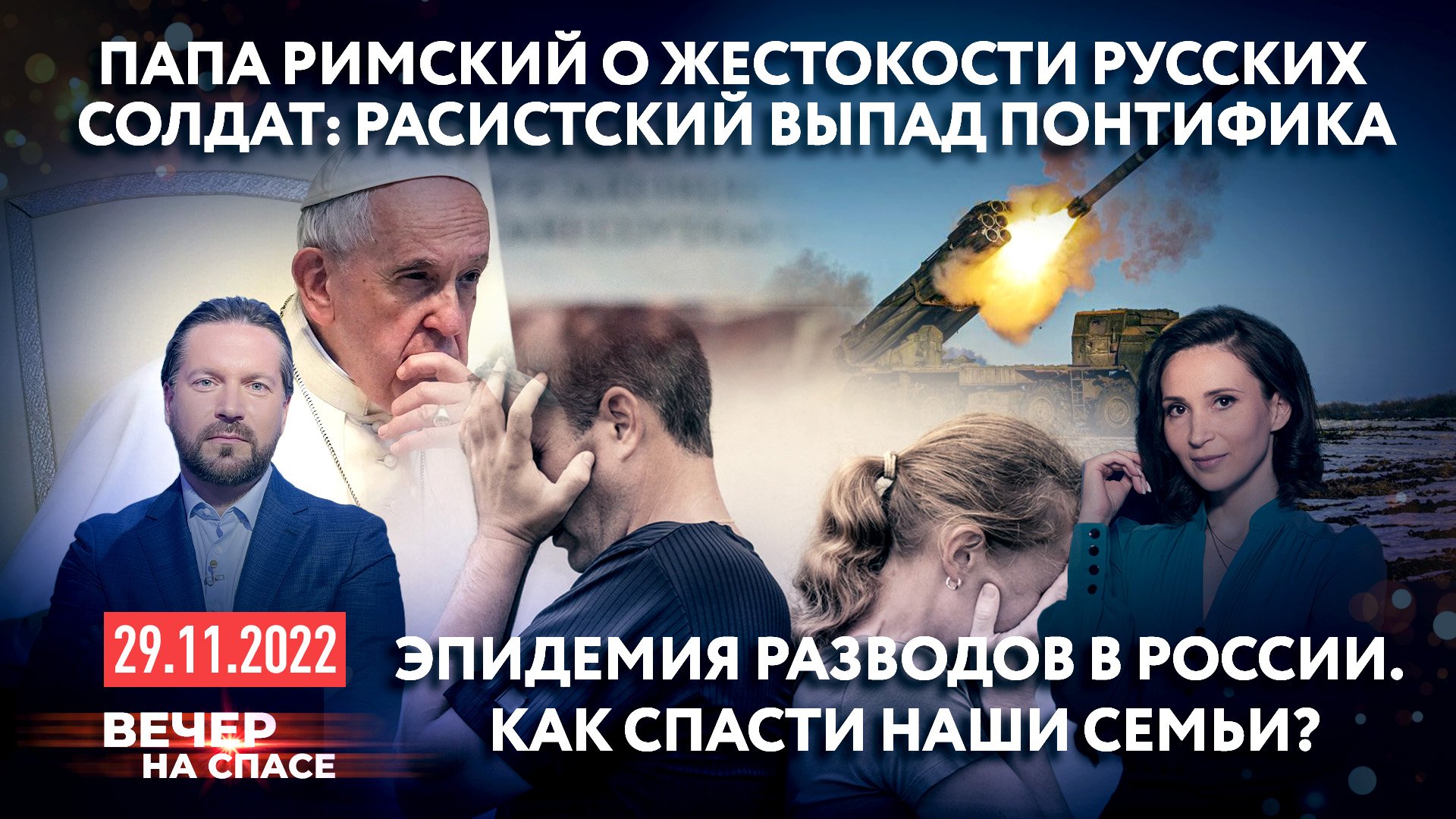 ⚡️В выпуске 29.11.22: ? В Кремле заявили о невозможности переговоров с Украиной, Владимир Зеленский может рассмотреть петицию о запрете Русской Православной Церкви. Расскажем о главных событиях этого дня. ? «На небесах более радости будет об одном грешнике кающемся, нежели о девяноста девяти праведниках». Разберемся в образах и смыслах Евангельского чтения с отцом Александром Никольским. ? Чеченцы и буряты самые жестокие? Скандальное заявление Папы Римского мы обсудим с президентом Академии наук Чеченской Республики Джамбулатом Умаровым. ? Карта епархий. Выйдем на прямую связь с Екатеринбургом. ? Новомученик дня. Актер театра и кино Юрий Батурин в новом выпуске нашего специального проекта о духовном подвиге жертв кровавого лихолетья. ? Семь разводов на десять браков – почему распадаются российские семьи? О тревожной статистике и роли института семьи в нашей стране мы поговорим с гостями в студии. ЭТО ВЕЧЕР НА СПАСЕ. ГЛАВНОЕ НА СЕГОДНЯ И… ВСЕГДА.