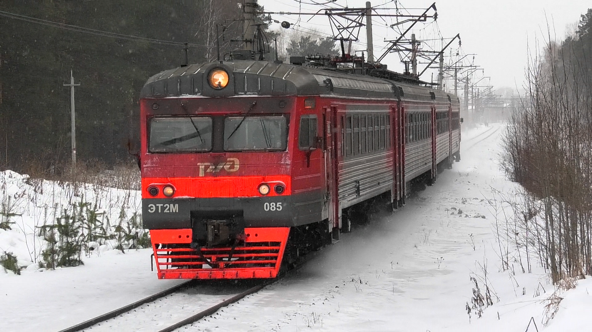 Электропоезд ЭТ2М-085 сообщением №6606/6653 Екатеринбург-Пасс. - Каменск-Уральский - Нижняя следует по перегону Путевка - Лечебный. Свердловская ЖД. Свердловская область, Россия. Приписка: ТЧ-11 Нижний Тагил (МВПС). 28.01.2023