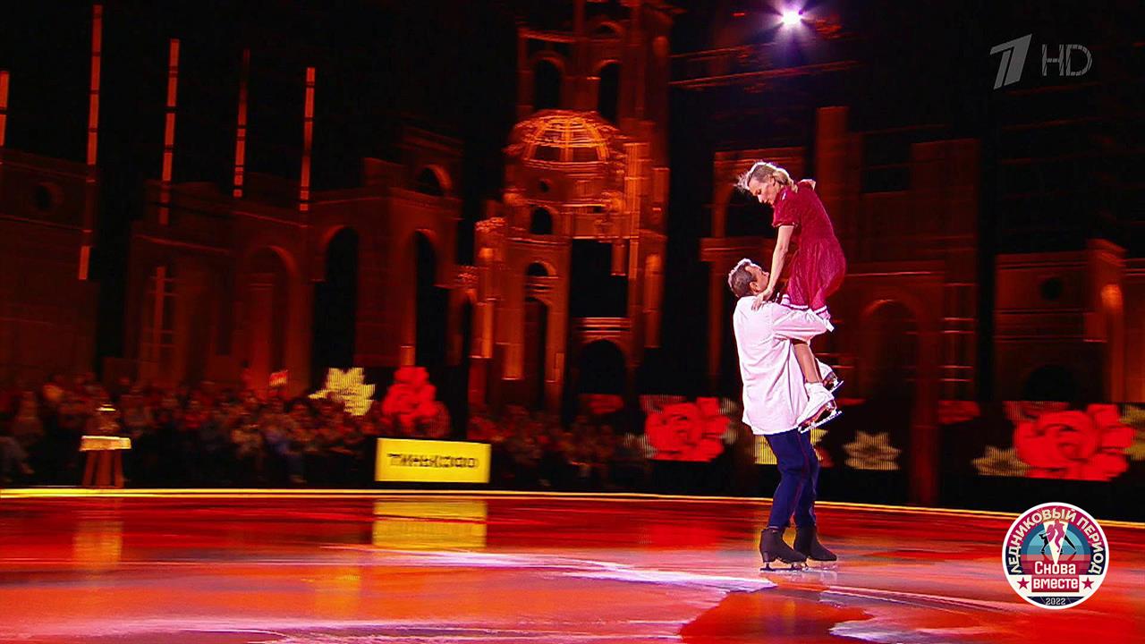 На льду — чемпионка мира Оксана Домнина и артист театра и кино Марат Башаров. Пара выступает под песню «Моя Марусечка» в исполнении Петра Лещенко.
