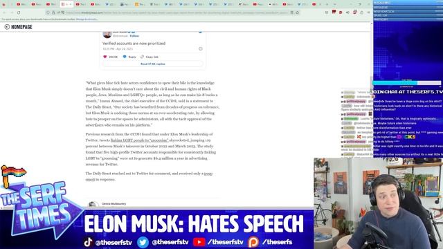 The hellsite just keeps getting worse Click▼ Want to listen to The Serf Times as a Podcast instead?! Check it out here! https://podcasts.apple.com/ca/podcast/the-serf-times/id1590946860 Come check out the new channel, Serfs at the Cinema! https://www.youtube.com/channel/UCdaeT_AEIiRXgkjmGSNLYrA/ RESOURCES TO GET MORE INVOLVED IN LEFTIST ACTIVISM: https://tinyurl.com/yy66ysyp NEW MERCH STORE IS UP! https://www.spreadshirt.ca/shop/user/theserfstv/ Check us out on Facebook! https://www.facebook.com/theserftimes If you enjoy what you see and hear don't feel shy about subscribing, liking or sharing our channel. If you'd like to support the show or channel there are multiple options below (and thank you so much). http://www.youtube.com/theserfstv Edited by Olive (please visit her Twitter!): https://twitter.com/olivemaybe Cover art by Kyle G: https://twitter.com/ItIsMeKyleG We broadcast live 5 days a week on TWITCH. Come join us and if you have Amazon Prime you can subscribe for free and help support the show. RESOURCES TO GET MORE INVOLVED IN LEFTIST ACTIVISM: https://tinyurl.com/yy66ysyp ►TWITCH - http://www.twitch.tv/theserfstv ►TWITTER - http://www.twitter.com/theserfstv ►INSTAGRAM - https://www.instagram.com/theserfstv ►SOUNDCLOUD - https://soundcloud.com/theserfstv ►DISCORD - https://discord.gg/P9T9Z3fUrG ►REDDIT - https://www.reddit.com/r/theserfstv ►OG WEBSITE - https://www.weareserfs.com Support the Serfs ►PATREON - http://www.patreon.com/theserfs ►MERCH - https://www.spreadshirt.ca/shop/user/theserfstv/ HARASSMENT NOTICE: This channel does not support or condone the harassment or brigading of any of the content creators we review or criticize. We provide commentary and criticism of their work and do not condone attacking or doxing in any way shape or form. While we have automatic filters on our comments for hate speech we do not control or endorse whatever public posts made on this channel. #elonmusk #tesla #twitter