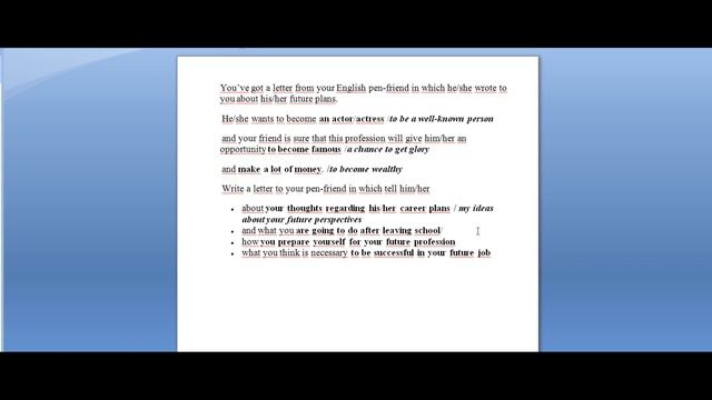 Сегодня пишем сочинение online. Несколько основных пунктов, опираясь на которые вы можете быстро написать ЛЮБОЕ сочинение. Основная идея –использовать МАКСИМУМ грамматических форм в одном сочинении. Конечно, вам не стоит брать абсолютно все, но такие упражнения – отличная тренировка и подготовка к стрессовой ситуации экзамена. Запомни: 1. Внимательно прочитай тему. Выдели ОСНОВНЫЕ задачи. 2. Подбери синонимы к наиболее необходимым для раскрытия темы словам и выражениям. Попросту говоря –перепиши своими словами задание:) 3. Продумай, какие слова из ОБЯЗАТЕЛЬНЫХ (first, moreover, at the end…) тебе понадобятся. 4. Пиши. 5. Прочитай написанное. Круто?:)) ВСЕ ПОЛУЧИТСЯ! наш канал в Telegram: https://t.me/joinusenglish my essay Dear Tom, I am so glad to get your letter! I miss our communication so badly. Besides, the news you wrote to me was fantastic! My friend is going to be a well-known person to have a chance to get the glory and become wealthy! Furthermore, when I was reading about your future perspectives, I had an idea to share with you which changes in my life I will make. First, I have never been to London and my parents gave me a trip there as a present. The main idea of this is that I could have more experience in speaking English. Second, before I finished school I had had some interviews and now I’m getting ready for the next step to my job As a result/Finally, to achieve perfect results in my work after finishing the study process I have been sitting in front of the computer and practicing my English all the time How are you there? What another piece of news do you prepare for your super busy Ukrainian friend? Looking forward to your next letter, BDV