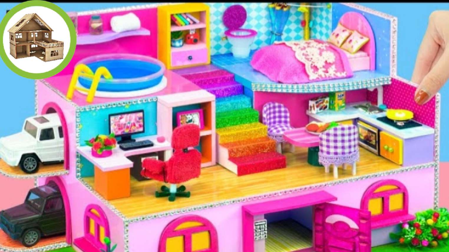 Шикарный трех этажный миниатюрный домик с двумя машинами для милого кота из картона /261
