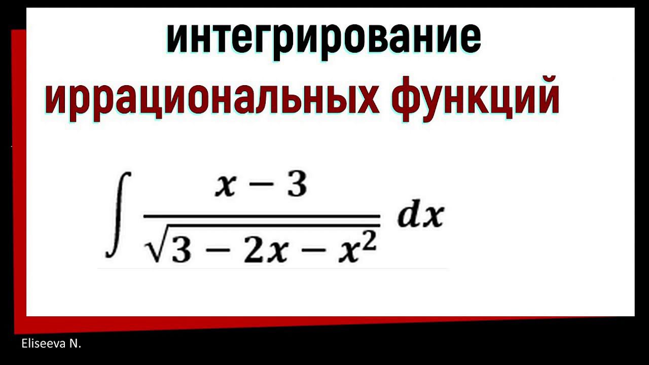 Как решить интеграл с корнем? Как вычислить интеграл с дробью и с корнем? Начинаем изучать интегралы от иррациональных функций (корни). Здесь существует много различных случаев. Разберем один из них, когда под корнем находится квадратный трехчлен. Решим пример: ∫(x-3)/√(3-2x-x^2 )dx Другой способ решения таких интегралов 8.2 Интегралы с корнем / интегралы с квадратным трехчленом https://youtu.be/p1RSqRmhhDY Вычисление интегралов, содержащих квадратный трехчлен: 5.1 Интегрирование функций, содержащих квадратный трехчлен. Ч1 https://youtu.be/5Iv3GnB3FGE 5.2 Интегрирование функций, содержащих квадратный трехчлен. Ч2 https://youtu.be/B9VLICkjTN8 Здесь это используется: 2.5 Интегрирование подведением под знак дифференциала Примеры https://youtu.be/TbdGjIJQXRs Все видео по теме НЕОПРЕДЕЛЕННЫЙ ИНТЕГРАЛ здесь: https://www.youtube.com/playlist?list=PLGtfmJuN1mTBK1Ik7HNy6ULc_Jo-hh0JD Загляни на канал и ПОДПИШИСЬ ! Там ещё много полезного, ОБЯЗАТЕЛЬНО ПРИГОДИТСЯ !!! Спасибо за просмотр! . . . Ключевые слова: неопределенный интеграл, интеграл, интегрирование иррациональных функций, интегрирование корней, интеграл с корнем, интегрирование корней, интегрирование функций содержащих квадратный трехчлен, интеграл от дроби содержащей под корнем квадратный трехчлен, квадратный трехчлен в под корнем в знаменателе дроби, интеграл квадратный трехчлен, методы интегрирования, метод непосредственного интегрирования, неопределенный интеграл примеры с решениями, формулы неопределенных интегралов, неопределенный интеграл dx, неопределенный интеграл онлайн, решение неопределенных интегралов, неопределенный интеграл примеры, найти неопределенный интеграл, методы неопределенного интеграла, интегрирование неопределенных интегралов, вычислить неопределенный интеграл, неопределенный интеграл с подробным решением, первообразная и неопределенный интеграл, таблица неопределенных интегралов, неопределенный интеграл подробно, свойства неопределенного интеграла, интегрирование, методы интегрирования, интегрирование интегралов, интегрирование функций, формулы интегрирования, интегрирование примеры, примеры интегрирования, правила интегрирования, метод интегрирования, интеграл решение, интеграл вычисление, интеграл таблица.